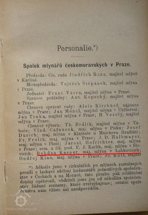 1899 - Bohdan Kasper členem výboru Spolku mlynářů česko-moravských, Kapesní kalendář mlýnů česko-moravských