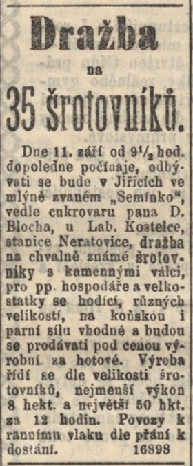 11. září 1892 se ve mlýně odbývala dražba na 35 šrotovníků. (RR)
