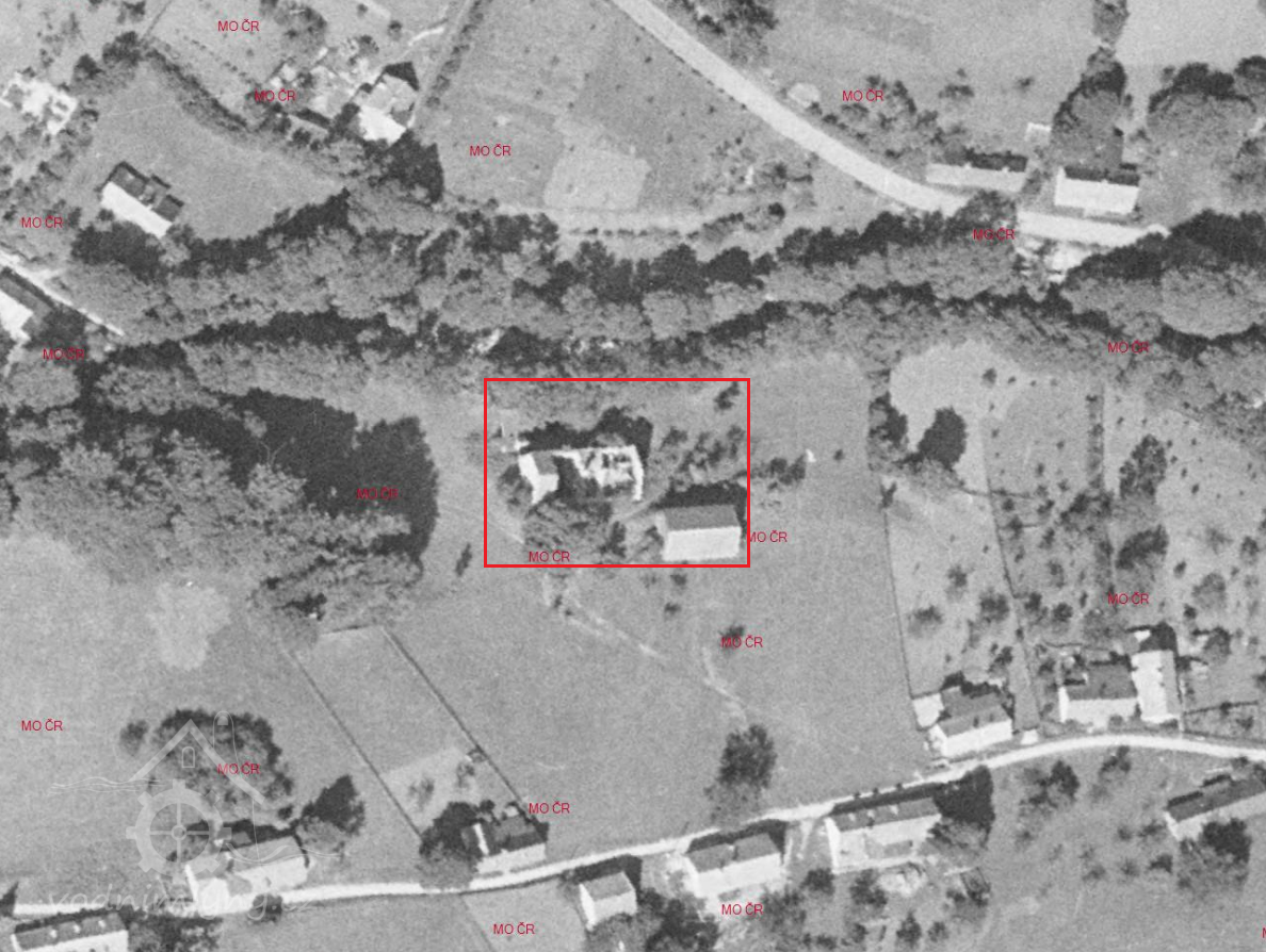 Letecký snímek z roku 1958 ukazuje jižní část budovy s již propadlou střechou.