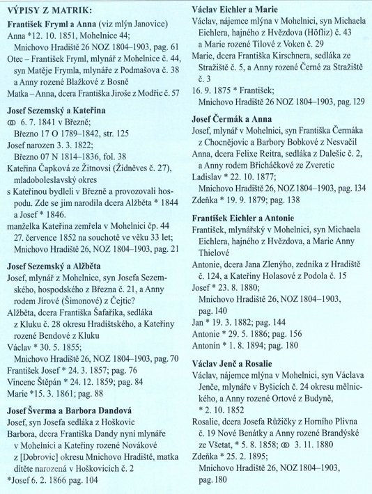 Počátkem 50. let 19. st. je zde jako mlynář uváděn Josef Sezemský. Narodil se 3. 3. 1822 v Březně čp. 21 v rodině hospodského. V roce 1841 se v Březně oženil s Kateřinou Čapkovou ze Židněvsi. Převzali po jeho rodičích hospodu a narodily se jim tam 2 děti – dcera Alžběta (1844) a syn Josef (1846). Poté odešli do Mohelnice, kde Kateřina 27. 7. 1852 zemřela na souchotiny ve věku 33 let. Josef Sezemecký se znovu oženil, a to s Alžbětou Šafaříkovou z Kluku. V roce 1854 nechal mlynář vztyčit před mlýnem sochu sv. Václava. Manželům se na mlýně narodili 4 potomci – synové Václav, Josef a Štěpán a dcera Marie. (MH)