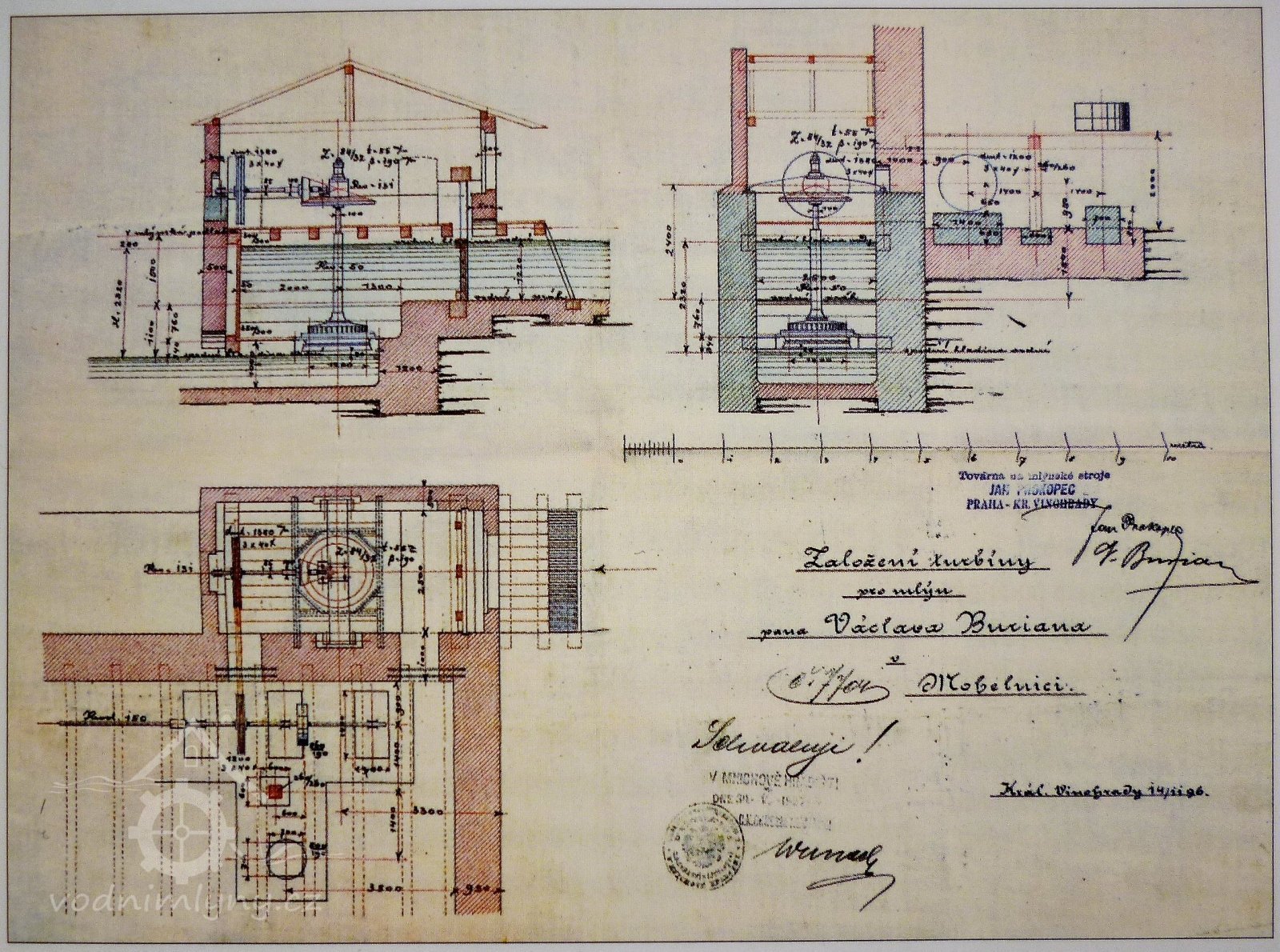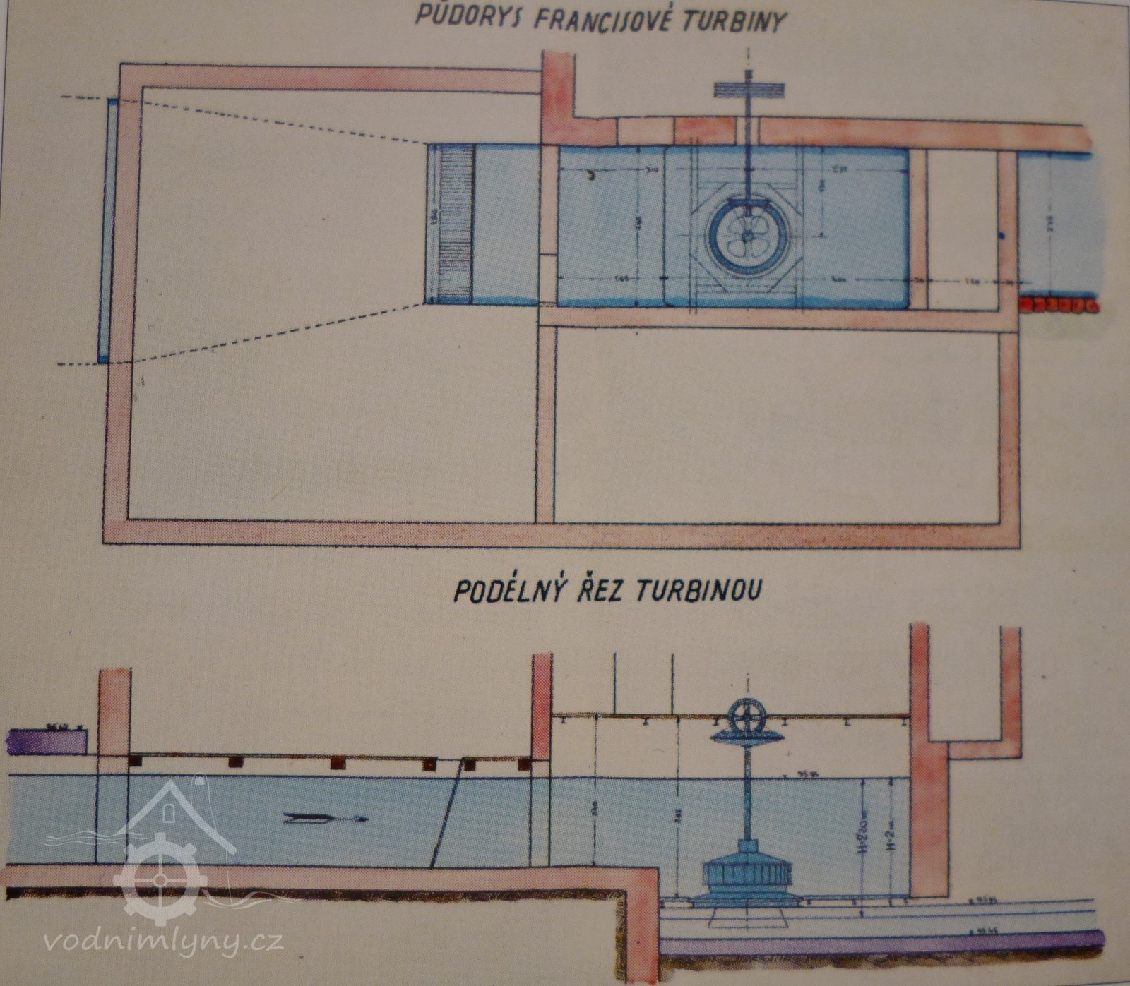 V roce 1906 byla původní Girardova turbína nahrazena Francisovou turbínou s vertikální hřídelí o průměru oběžného kola 900 mm, hltnosti 1,182 m3, spádu 2 200 mm a největším výkonu 26 HP. Turbínu instalovala firma Josef Kohout z Prahy – Smíchova. (MH)
