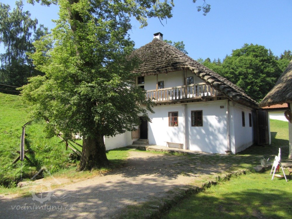 Průčelí mlýna s mlýnicí (vlevo od vchodu) a obytnou částí. Stav před zahájením záchranných prací. Mlýnice ukrývá ucelené nejstarší české složení s pozůstatky kladivové krupní stoupy. Vpravo vpředu chlév s kolnou, vzadu stodola, vše kryto došky., 2006, © Ivo Hořejš