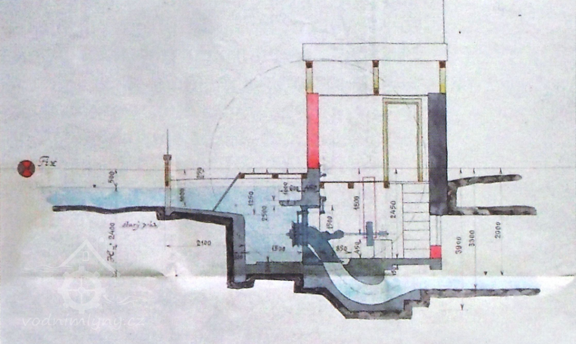 PopisPůvodně do roku 1919 vodní kolo na střední vodu, prům. 5,75 m, šířka 82 cm, osazené na dubovém hřídeli, pak Francisova turbína.(MH)
