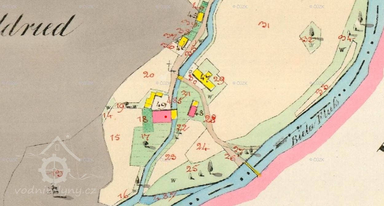 PopisV roce 1930 pohání papírnu 3 Francisovy turbíny s průtokem 2.63, 1.47 a 1.99 m3/s, spádem 5.2, 5.2 a 3.45 m o výkonu 237 HP.