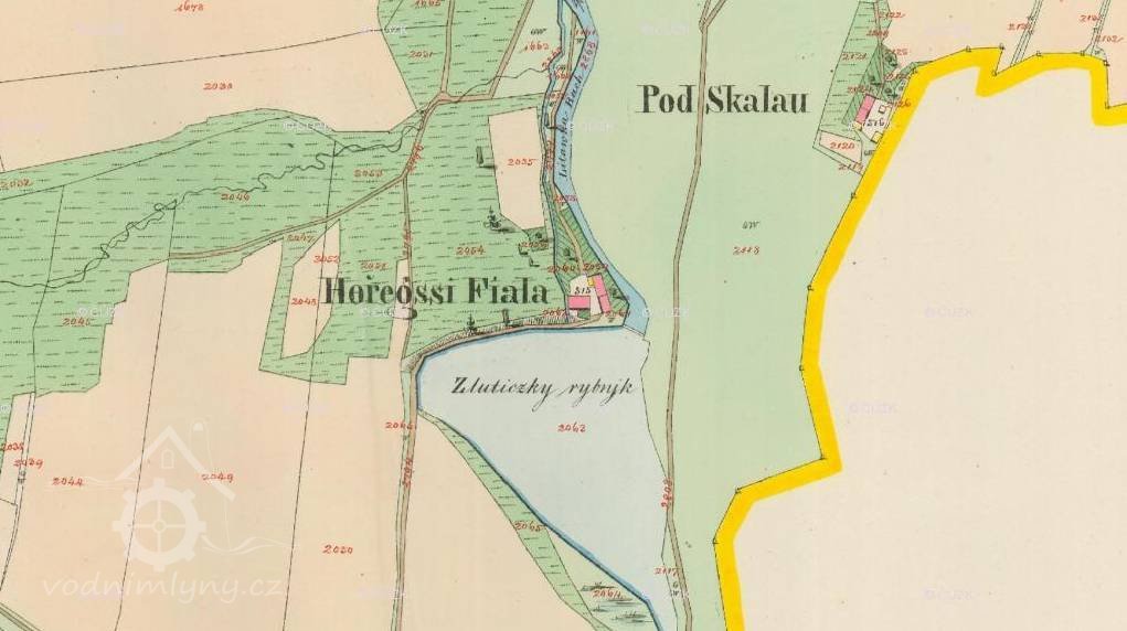 Již v roce 1779 koupil syn Matěje Fialy – František Fiala – mlýn na Příbramském potoce, ležící pod výše zmíněným mlýnem pod Brodem. Tento mlýn používal místo nádržky obecní rybník, vybudovaný v roce 1713.  Po zřejmě prvním majiteli mlýna Janu Žlutickém byl posléze pojmenován i rybník, který mezi roky 1812 a 1848 připadl k mlýnu. Čtyři generace Fialů tu hospodařily asi 140 let, a tak se i rybníku začalo říkat Fialův.