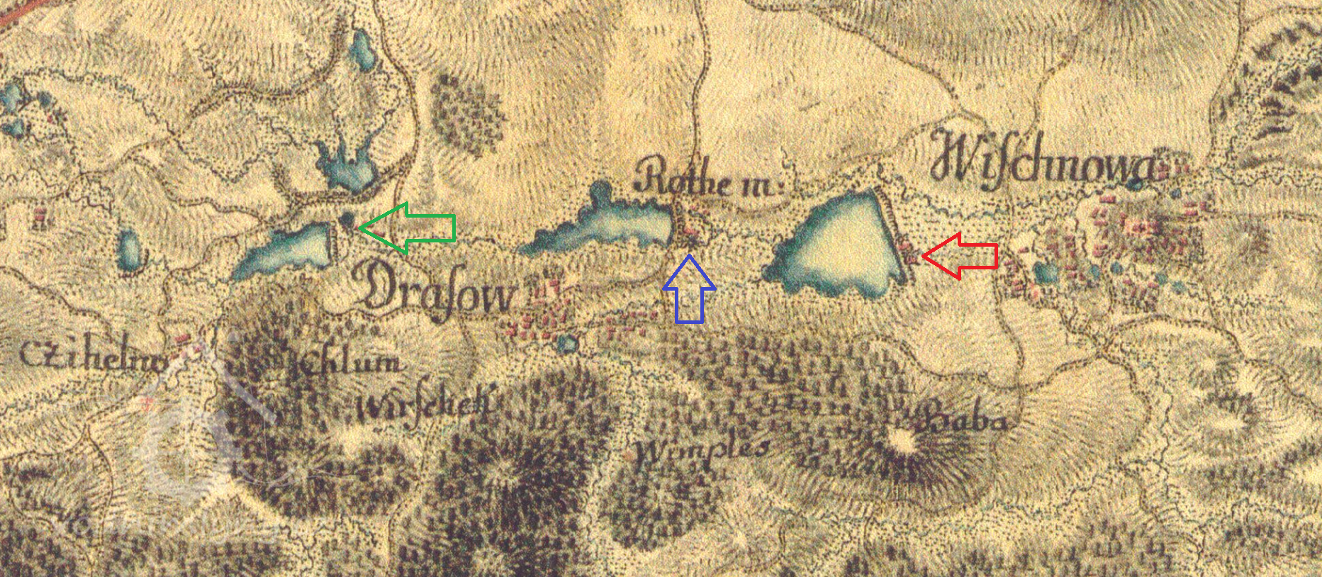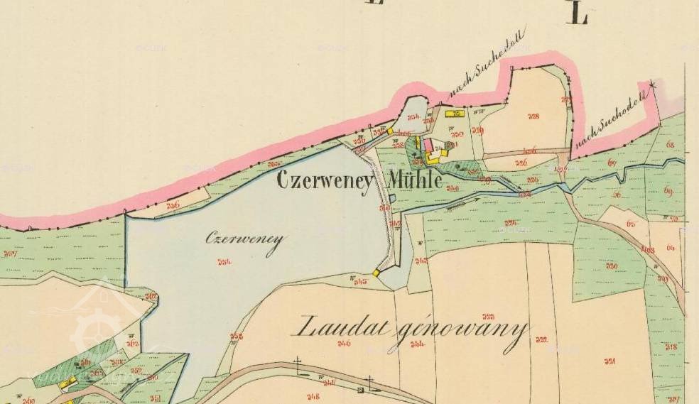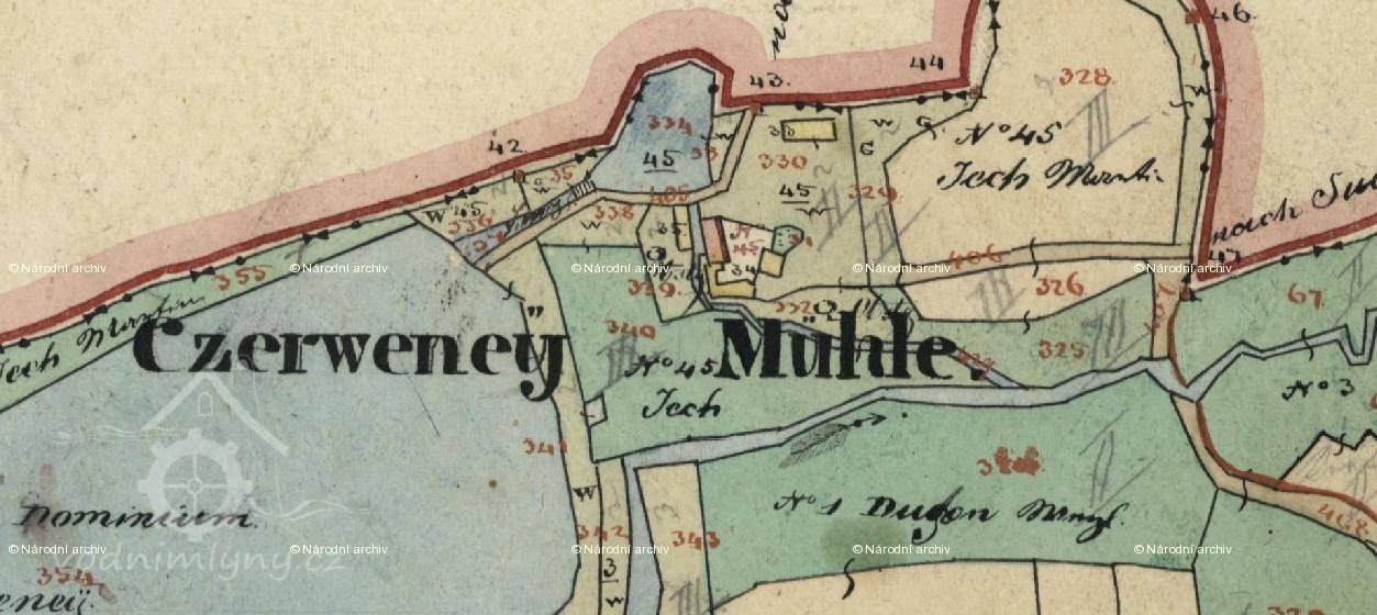 Červený rybník (3,5 ha) nad mlýnem.