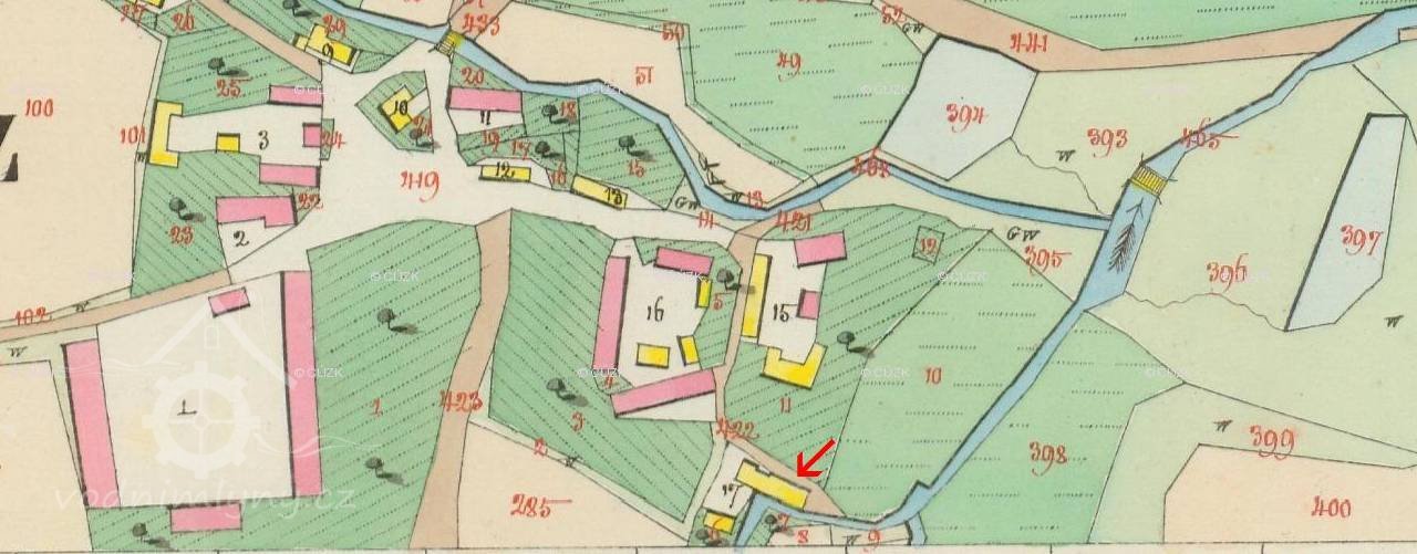 1857 na čp. 14 připomínán výminkář Jan Gärtner s manž. Annou