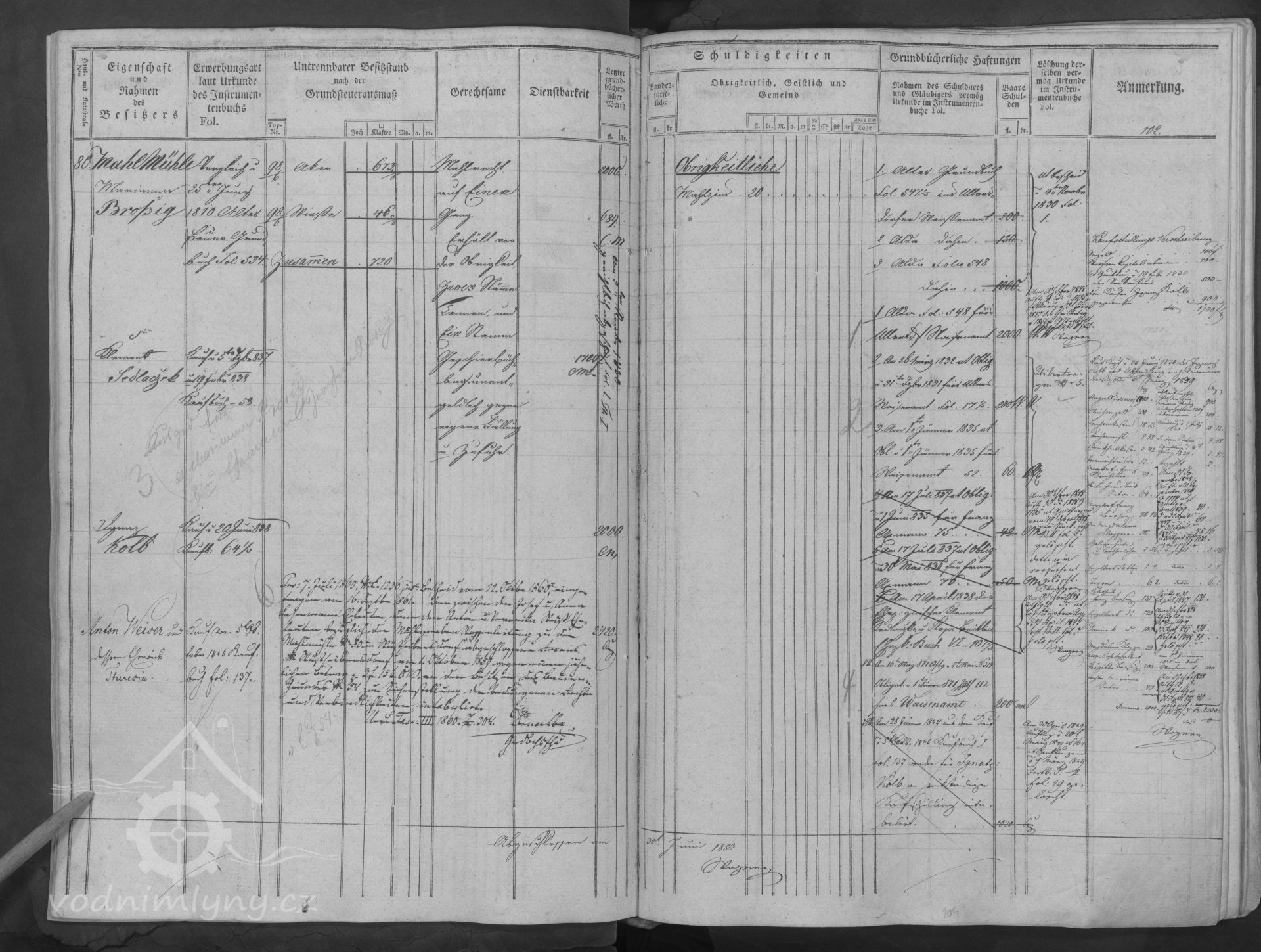 První zápis v pozemkové knize se vztahuje k roku 1810, kdy mlýn vlastní M. Brosig, poté Kement Sedlaczek a v roce 1838 Ignaz Kolb.