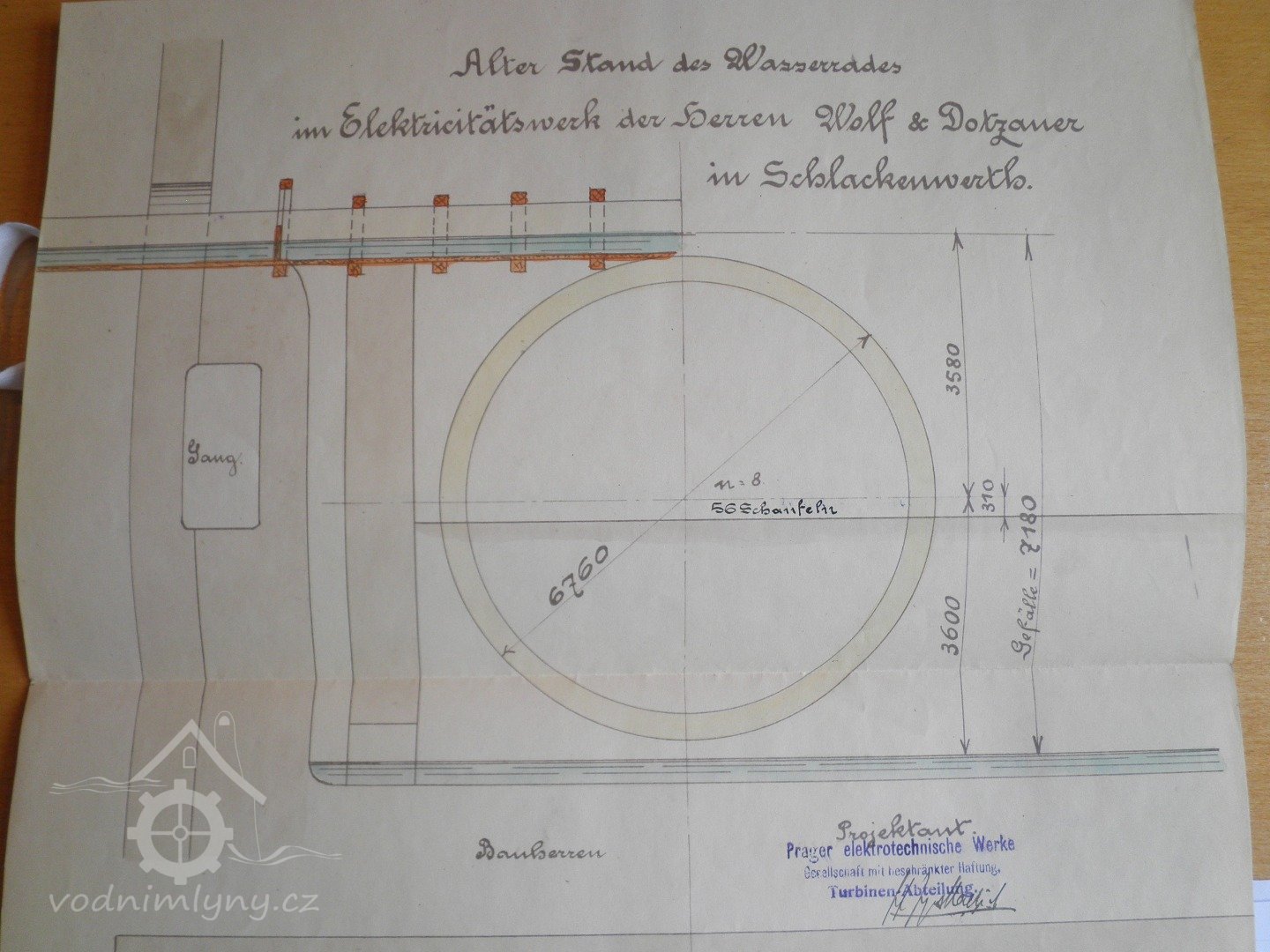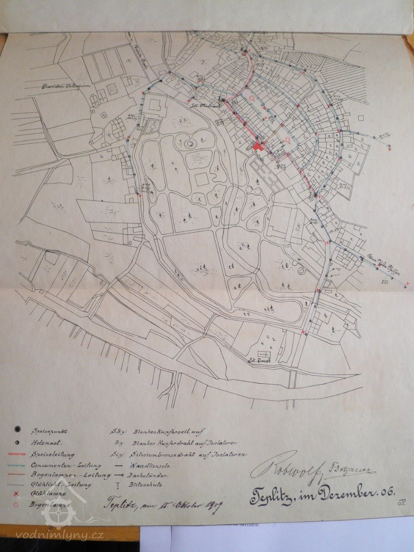 Po technické stránce zde bývalo po staletí umístěné dřevěné vodní kolo pro moučný mlýn a voda také sloužila k okrase parku ve formě kaskád, jak je vidět i s dlouhým náhonem na četných rytinách starého Ostrova. Nová technologie využití vodní síly přichází v říjnu 1909, kdy lékárník F. Dotzauer z čp. 8 a R. Wolf, majitel továrny na kůže čp. 177, žádají c.k. okresní hejtmanství o zřízení elektrárny pro místní obec Ostrov, a to hlavně jako zdroj pro veřejné osvětlení. Zařízení mělo sestávat z vodního kola o průměru 6.76 m, šířce 1.45 m a 56 lopatek s transmisí na zadní stěně a odtud by řemeny poháněly tři dynama (2x11 kW a jednou 8 kW), dvě hlavní by vyráběla stejnosměrný proud 230V a menší by dobíjelo akumulátory (128 článků systém TUDOR s kapacitou 162/218 Ah), které měly za úkol vyrovnávat výkyvy napětí způsobené vodním kolem, akumulovat energii pro špičkový odběr a rozdělit napětí 230 V na 115 V přiváděných ke spotřebiteli. Ovládací přístroje byly na pěti mramorových deskách. Z elektrárny pak vedlo napájecí vedení do hlavních bodů (2x50mm2 a 1x35mm2), pak rozdělovací vedení ke spotřebním místům a vedení veřejného osvětlení (2,5 mm bronz). K veřejnému osvětlení byly použity 3 obloukové lampy a 36 žárovek. Zakázku prováděla AEG Union Elektrizitatsgesellschaft v Teplicích. Na projednání stavby byla stanovena schůzka v pondělí 10. ledna 1910 v 11.30 a kolaudace proběhla 10. června 1910 v 7.45 hod. V roce 1911 pak ještě došlo k rozšíření osvětlení o Nádražní ulici a nádraží.