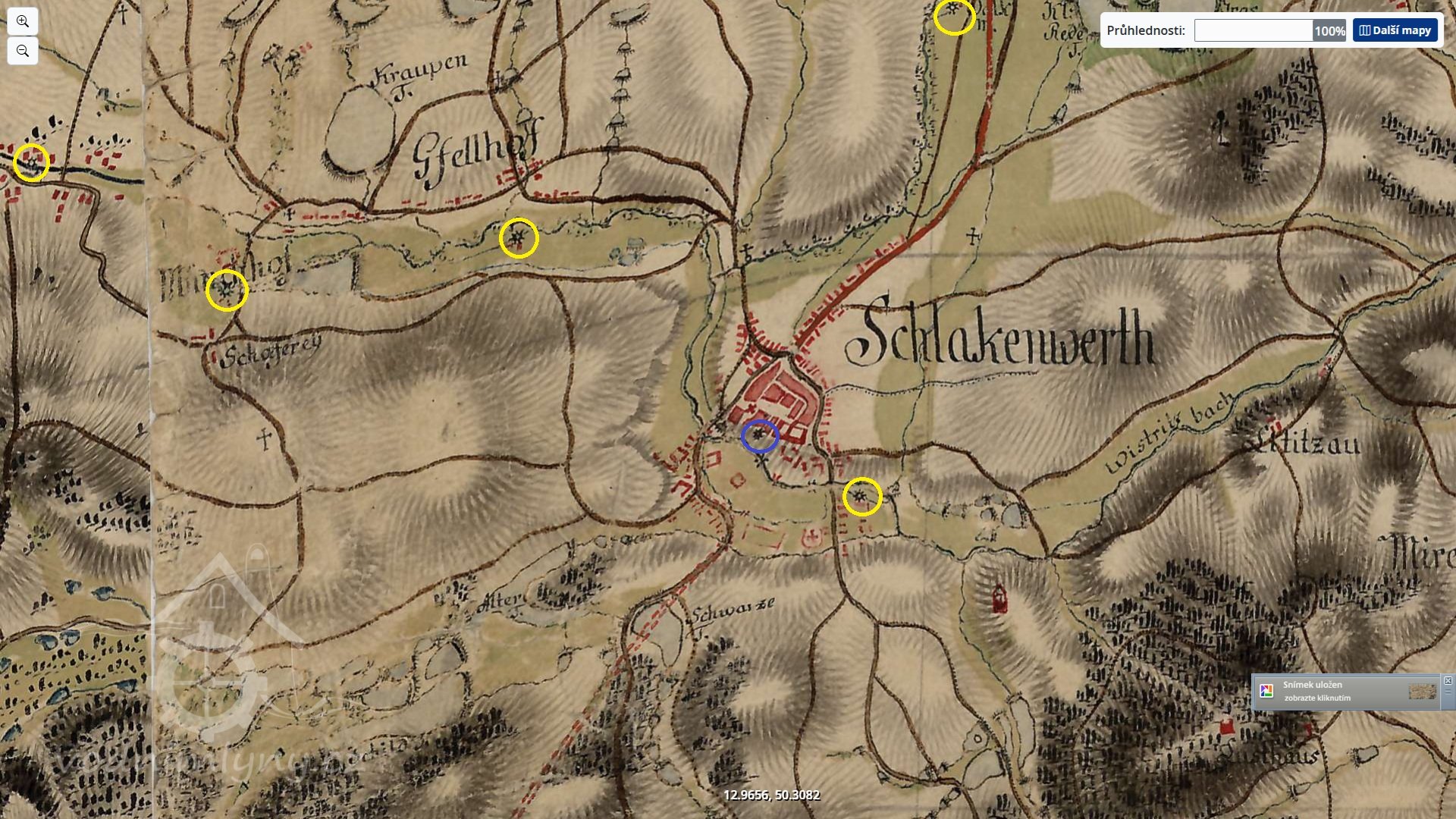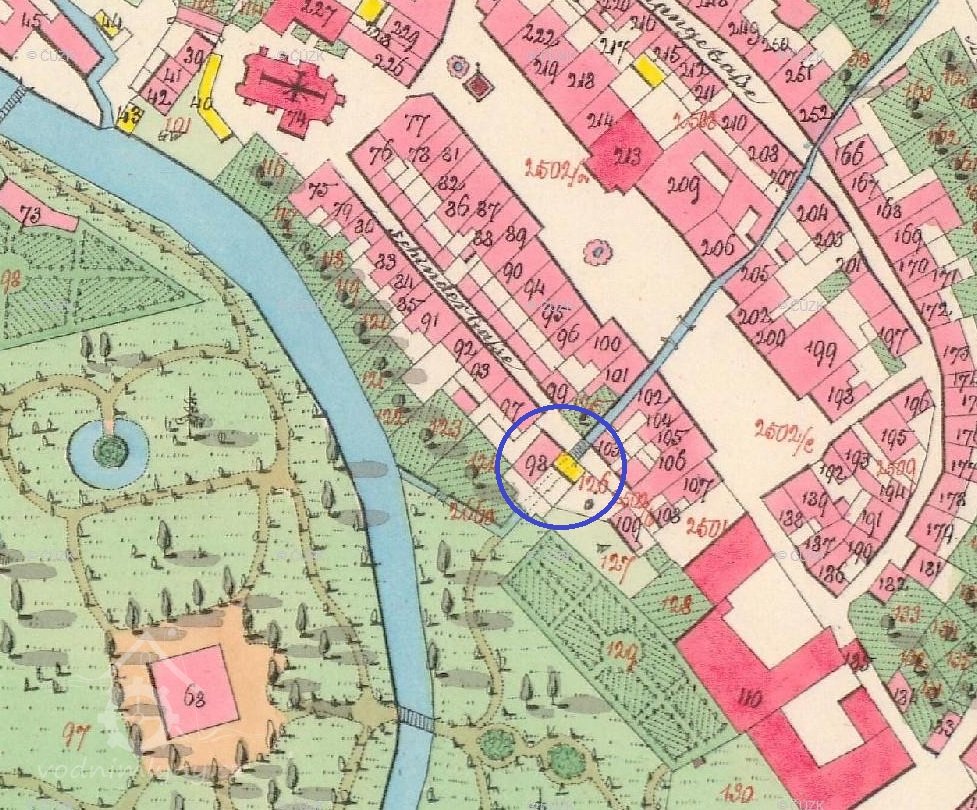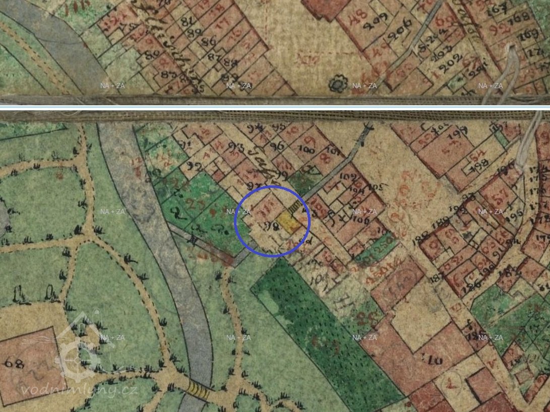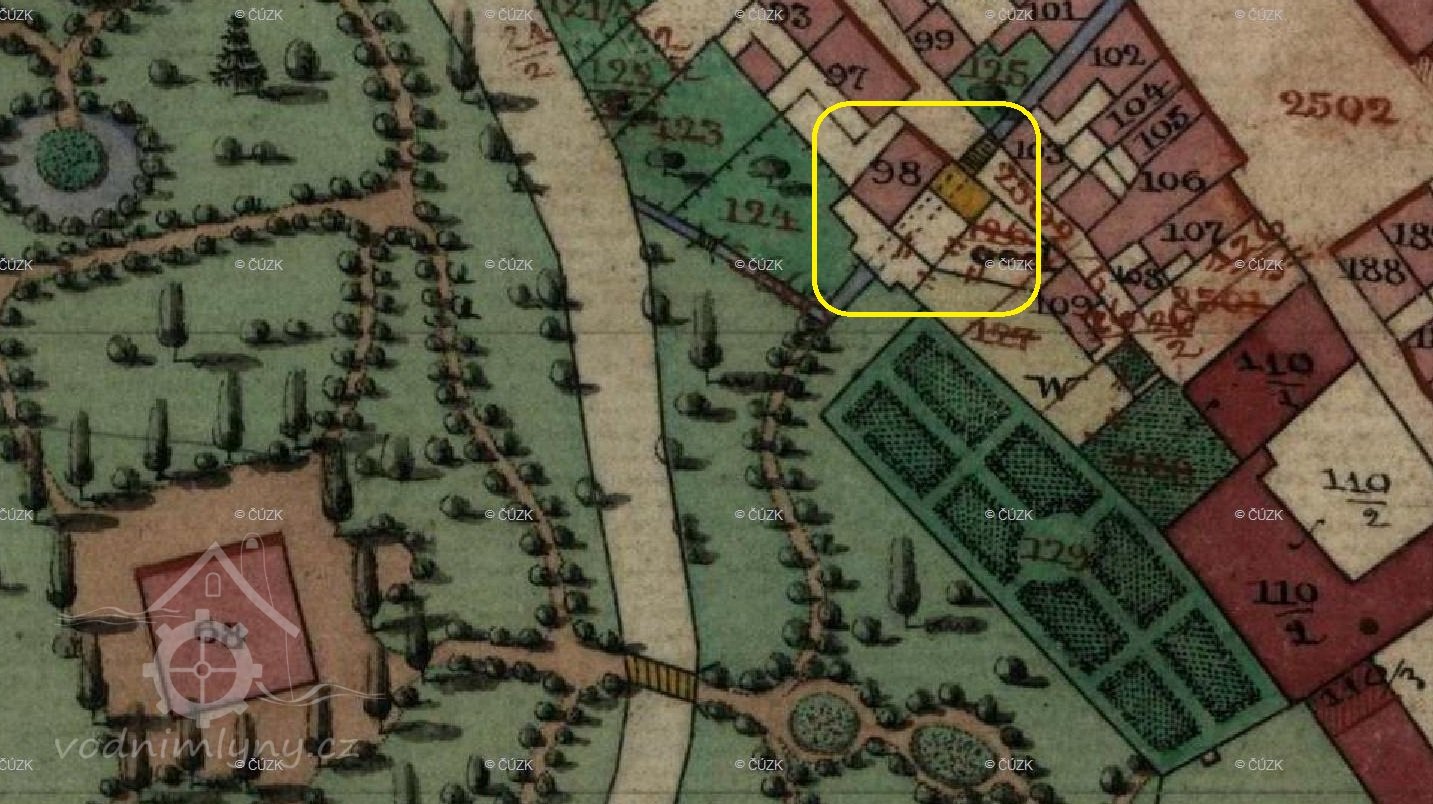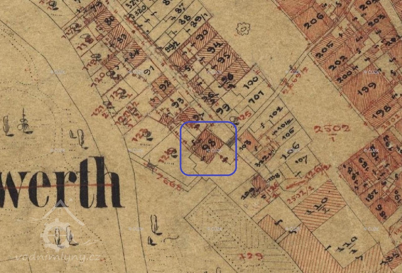 Za opravenou Věží velkého muže, na parcele č. 98 v bývalé Řeznické ulici č.p. 111(dnešní Žižkova), byla jedna z lokalit, kde se po staletí využívala vodní síla. Nikdo asi nezjistí, kdy se vybudoval náhon z Jáchymovského potoka anebo kdy se roztočilo vodní kolo moučného mlýna ,,Stadmühle". Náhon zde byl už roku 1525 odkrytý, musel se čistit a občas způsoboval malé zátopy. U horní brány byl odběr vody a dřevěnými trubkami se zásobovala horní a dolní kašna na náměstí. Až do roku 1838 byly kašny dřevěné, pak kamenné. V polovině 16 století bylo v Ostrově 5 mlýnů (o pátém přesně nevíme, kde stával), kde mlynáři provozovali své živnosti. Další zmínka je z roku 1632, kdy mlýn koupilo ostrovské panství za 2300 zlatých od Christopha Wernera. V roce 1794 ale byl zase prodán měšťanům a to za 835 zlatých a 42 krejcarů s tím, že panstvu bude nadále platit činži ve výši 200 zlatých. Při velkém požáru roku 1607 byl zmíněn mlýn ve městě o 4 složeních (jedno složení představují dva mlýnské kameny), ke kterému vedl náhon, sloužící také k máchání prádla a máčení kůží. V roce 1665 byly ve městě ještě 4 mlýny (Neumühle, Stadtmühle, Steinbrückemühle, Weissemühle) a roku 1731 už jen tři. Weissemühle byl zrušen a podle J. Kühnla se zde v 17. století řezal kámen pro početné sochy (neboť v roce 1685 začala stavba nového zámku). Poté zde máme zaznamenány majitele z katastrálních knih, kdy v roce 1860 koupil polovinu nemovitosti Johan Nauthe, kterou pak předal svým třem dětem. V roce 1887 se vlastníkem jedné poloviny stávají pánové Johann Dotzauer a Leo Wolf a druhé poloviny Judr. Heinrich Zloch a Karl Vogl. Poté se majetky převádí v rámci rodin a v roce 1910 se stávají majiteli Friedrich Dotzauer a ing. Robert Wolf. V roce 1930 jsou majiteli nemovitosti, včetně stavidla na Jáchymovském potoce Gustav a Bohumir Bukert.