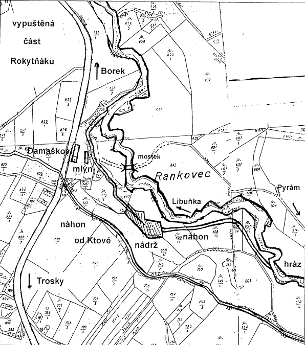 Ladislav Šourek: obejdeme-li Damaškovo stavení zezadu, máme před sebou mlýnskou struhu přímo ukázkovou. Dolní konec zabíhá zpět do Libuňky asi sto metrů pod domem. Půjdeme-li proto proudu (dnes už to žádný není, struha je hodně zarostlá a zasypaná), tak asi po 250 metrech narazíme na zbytky vodní nádrže. Nádrž je mírně vpravo od náhony, ten se ale stejně jako Libuňka, točí vlevo.