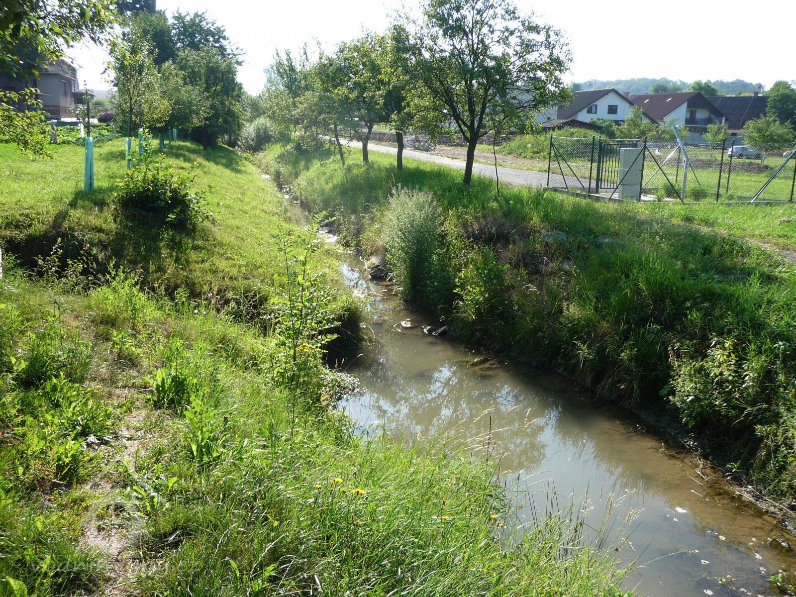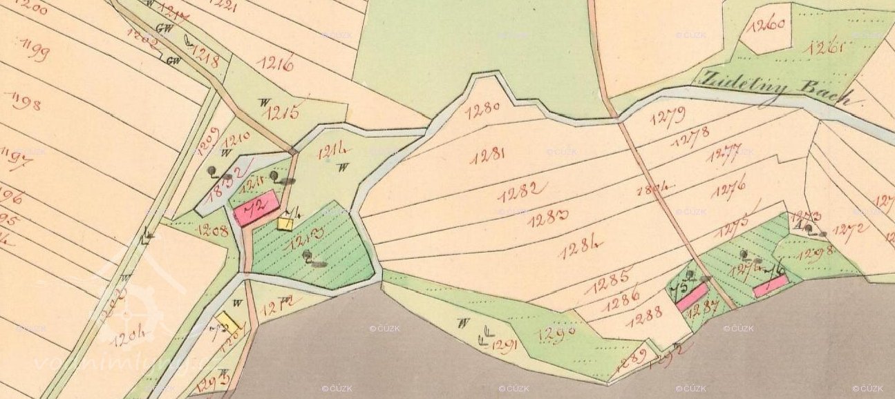 Voda přiváděna strouhou od kamenného splavu nedaleko mlýna z potoka Židelná (Svodnice). Vodní náhon se zástavou je dosud v terénu patrný.