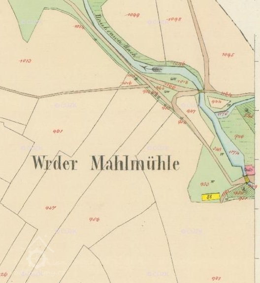 PopisV roce 1930 měl mlýn 1 kolo na spodní vodu, hltnost 0,723 m3/s, spád 2 m, výkon 5,77 HP.