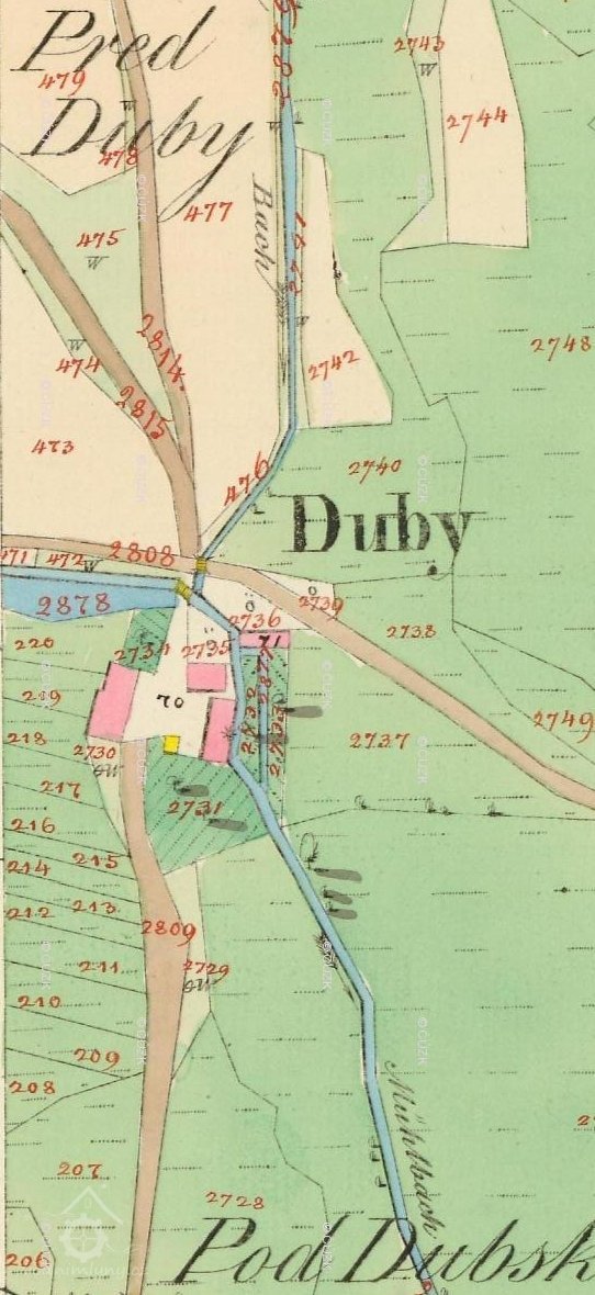 V roce 1841 zde  působil mlynář Vavřinec Říha i s rodinou. V roce 1854 převzal mlýn jeho syn, Tomáš Říha, který zde byl rovněž se svou rodinou. Před rokem 1866 je mlýn v nájmu Josefa Dyka, potomka slavného mlynářského rodu ze Žichlic. Od roku  1886 je uváděn na dubském mlýně mlynář Josef Vrchlavský, v roce  1890 Ludvík Oberreiter.