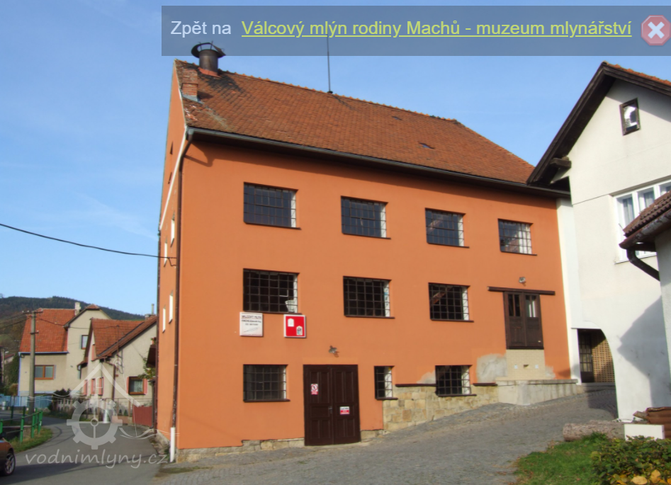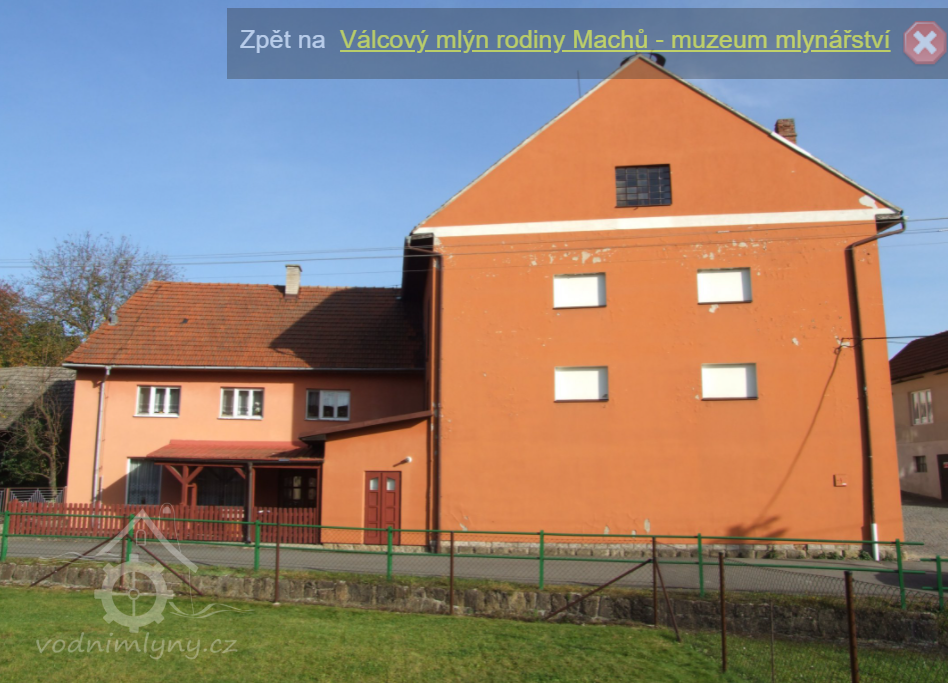 Mlýn z 19. století vlastní rodina Machů od roku 1914. V roce 1942 nechal Josef Machů mlýn rozšířit, strojní zařízení doplnil o plynosací motor. Roku 1951 byl válcový mlýn zařazen do hospodářského družstva, později byl provoz zastaven. V roce 1991 syn posledního majitele provoz mlýna obnovil a zpracovává v něm obilí na všechny druhy mouky. V přízemí třípatrové budovy jsou hnací stroje, transmisní rozvod, násypky dopravníků a kartáčovačka. V prvním patře je loupačka, mlecí stolice, váha a pytlování. Ve druhém patře jsou sila, čistička, vysévače, reforma a prachové filtry. V posledním patře je podstřešní transmisní pohon a hnací zařízení zrnových výtahů. Fasáda mlýna má cihlovou barvu.