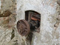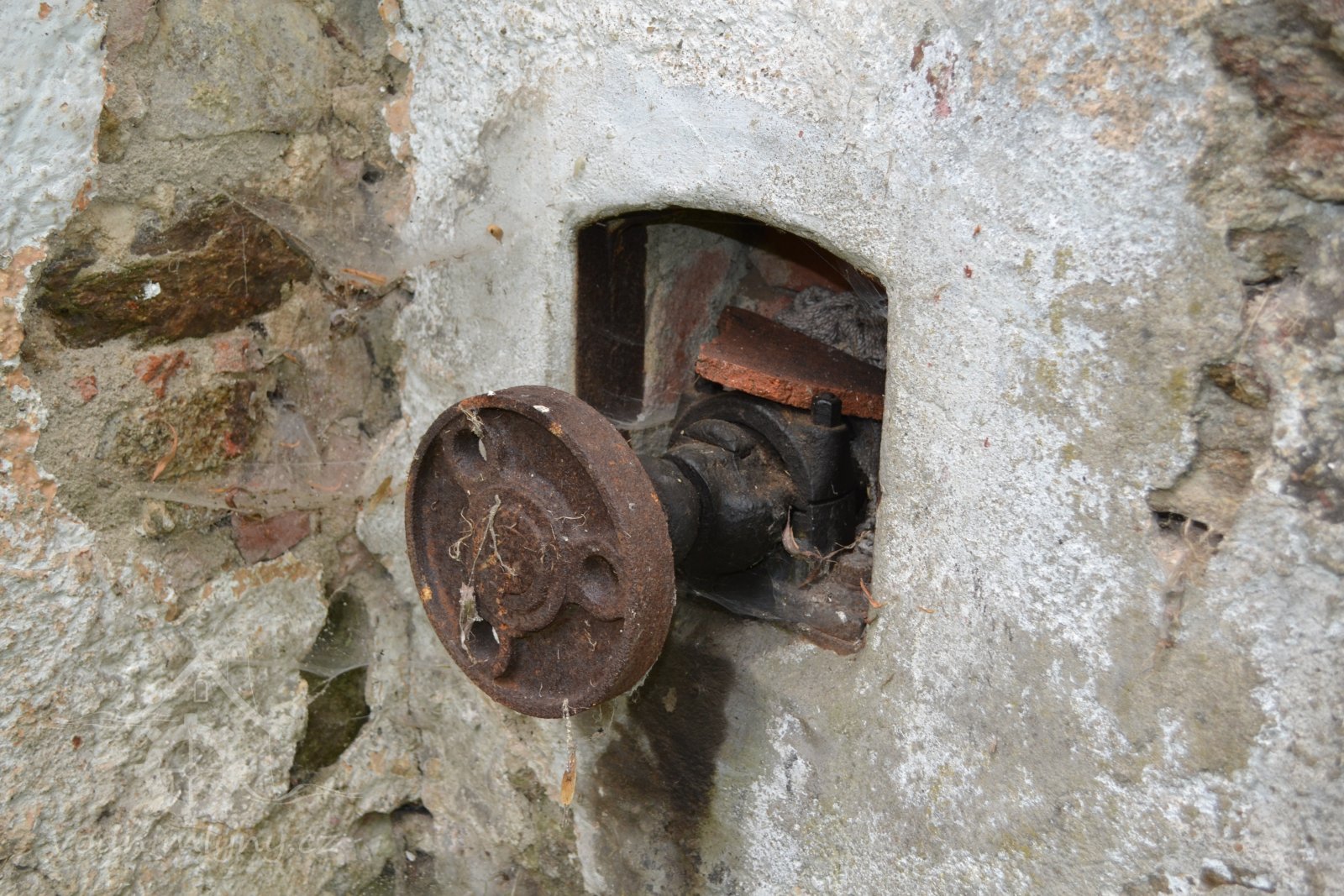 Na venkovní stěně mlýna se dochovala transmise k pohonu zemědělských strojů