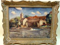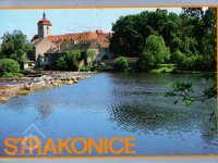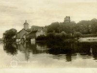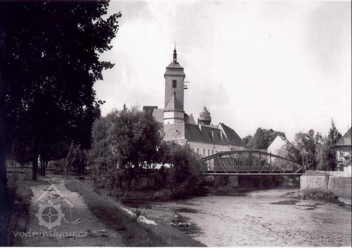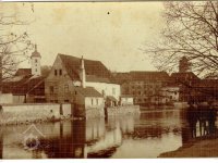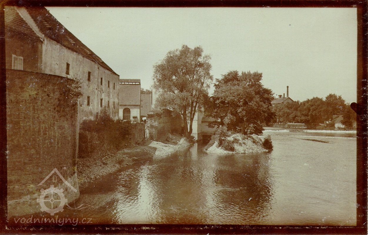 Mlýn stojí vpravo za řekou, nedatováno, © autor neznámý, viz http://www.strakonice.masi.cz/