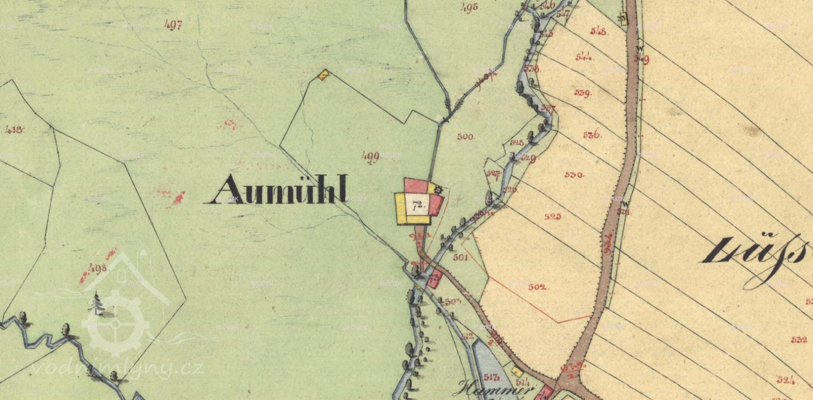 Mlýn a pila na potoce Olšina , stavení č.p. 3 a 4, patřící rodině Pangerl.