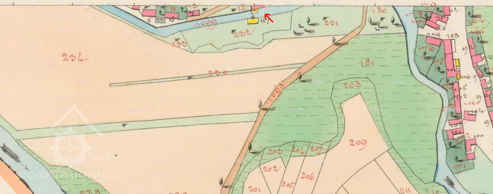 mlýn na levé straně náhonu, na pravé straně vodárna, krupník, mlátička a pila na řezání kamene