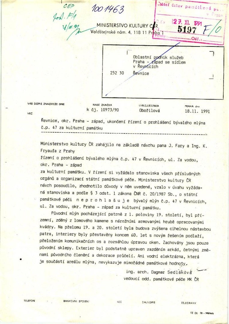 U dalších zmínek o mlýnech v Řevnicích není dnes přesně známá jejich poloha.