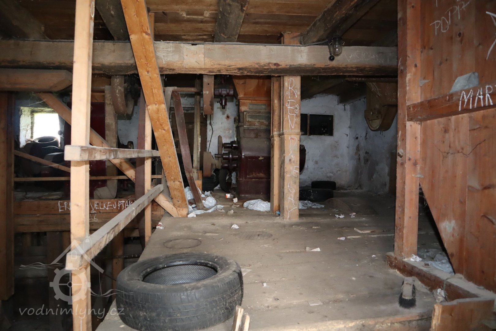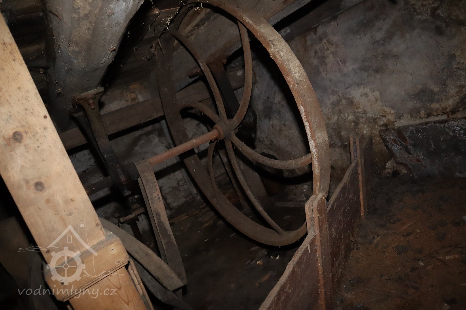 Zařízení mlýnice - suterén, 2020, © BeJi, (Prvky na obrázku: transmise, řemenice, převody, mlýnská hranice)