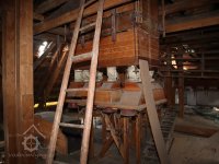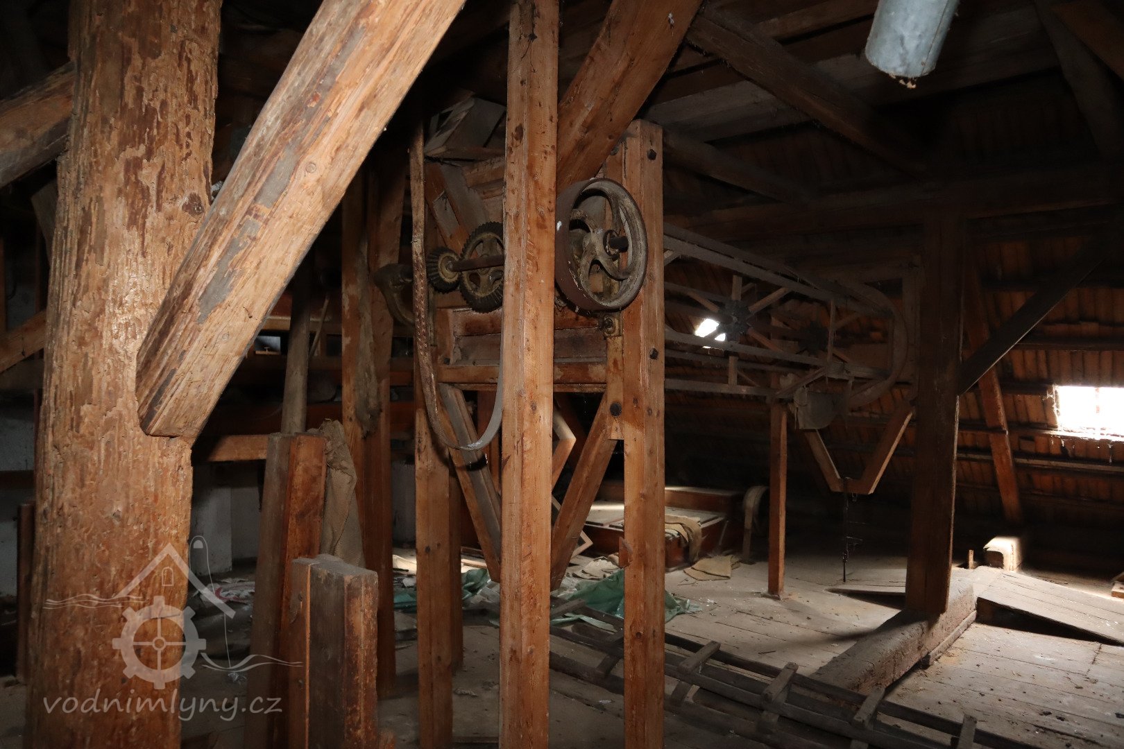 Zařízení mlýnice - podkroví, 2020, © BeJi, (Prvky na obrázku: transmise, řemenice, převody, výtahy a dopravníky)