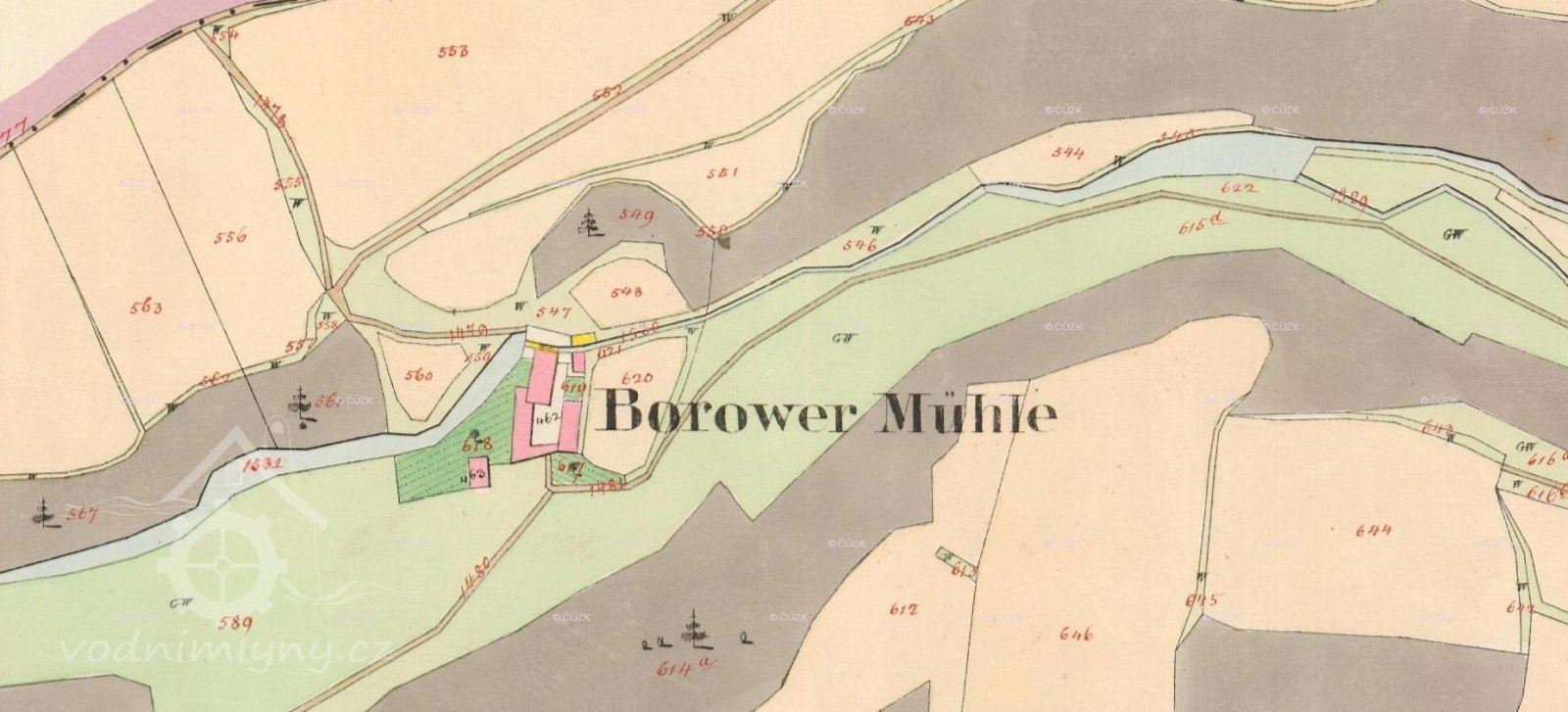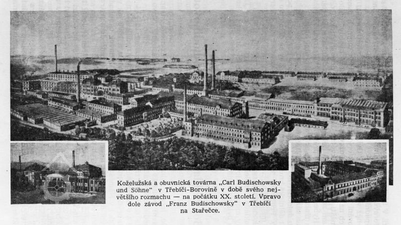 Roku 1842 Carl Budischowsky (1810–1884) společně s bratrem Franzem (1808–1885) od mlynáře Padrty zakoupili Borovský mlýn na Stařečském potoku a vybudovali při něm koželužské dílny a také cihelnu, která se stala základem stavebního rozvoje podniku. Koncem čtyřicátých let získal Carl císařskokrálovské privilegium a také vojenské zakázky, a tak mohl roku 1853 z podniku vyplatit bratra, který se nadále věnoval původnímu rodinnému podniku na Stařečce. Areál kolem mlýna tehdy dostal podobu obdélného dvora, tvořeného patrovými budovami, větší část jejich přízemí zabíraly louhovací a činicí kádě. Stavby pro něj v té době prováděl zednický mistr Martin Hersan ze známého stavitelského rodu. První parní stroj zakoupil již v polovině padesátých let, roku 1858, údajně jako první v Rakousku-Uhersku zavedl americké stroje s pásovými noži na štípání (ploché řezání) kůží. Od poloviny šedesátých letech vyráběl kompletní vojenskou koženou výstroj – boty, ale také opasky nebo sedla, a postupně ovládl veškeré armádní dodávky tohoto zboží. V sedmdesátých letech do firmy postupně vstupovali synové zakladatele, vedení se ujal nejstarší Johann Budischowsky (1845–1915), August (1846–1915) ve Vídni vedl obchodní zastoupení a továrnu na hnací řemeny, podíly drželi také Emil (1852–1909) a Ernst (1856–1914). Technologický náskok si udrželi zavedením anglických postupů činění spodkové buvolí kůže (1875) a kůží divokého východoindického skotu – kipsů. Extenzivní stavební rozvoj závodu v devadesátých letech vedl výrobní ředitel, inženýr Eduard Beutel, který roku 1891 navrhl obuvnické dílny v podobě šedového sálu. Cihelna byla roku 1896 vybavena čtrnáctikomorovou kruhovou pecí, kterou provedla pražská firma Outeřický & Pittner, roku 1899 byla ještě rozšířena a zvýšena nadpecní sušárna. Z jejích výrobků pak byly podle Beutelova projektu postupně do konce století vystavěny dvě obdobné dvoupatrové výrobní budovy se šedesáti jamami v přízemí, úpravnami v prvním patře a sušárnami ve druhém – druhá koželužna, východněji položená, se dochovala v téměř původní podobě na parcele 462/5 uprostřed areálu dodnes (dnes Selva Shoes). Pro zaměstnance, jejichž počet roku 1906 přesáhl tisícovku, byla nad továrnou (při dnešní ulici Spojenců) vystavěna v letech 1902–1904 nejprve kantýna (dochovaná budova čp. 184) a vedle ní dům mistrů, v letech 1905–1912 pak kolonie dvaceti dvojdomků. Roku 1910 navrhl a provedl třebíčský stavitel Raimund Wolf nový obuvnický šedový sál na půdoryse 87 × 40 metrů. Synové Johanna Budischowského, Robert (1883–1918) a Johann (1887–?), nastoupili do vedení firmy na počátku první světové války, během níž vyráběla výhradně pro armádu – 2 500 zaměstnanců tehdy vyčinilo týdně 8 000 kůží a ušilo denně 5 000 párů bot. Tento rozmach dnes dokumentuje především budova louhovny na východním konci areálu na parcele 462/1, navržená třebíčským stavitelem Františkem Brázdou roku 1915 jako nástavba přízemní budovy z roku 1911. Trojtrakt na zalomeném půdoryse tvoří masivní cihlové obvodové zdivo a železobetonové stropy na značný rozpon 8,4 + 7,2 + 8,4 metru. O rok později byly postaveny také domy s kancelářemi a byty vedoucích zaměstnanců, které tvoří bránu do areálu (vpravo dnes čp. 1070). Autorem poněkud bizarního celku by snad mohl být pražský architekt Max Spielmann (1881–1970), který roku 1914 navrhl novobarokní vilu čp. 287 na kopci nad továrnou pro Johanna (Hanse) Budischowského. Ten již roku 1917 vytvořil s Vídeňskou bankou Merkur novou akciovou společnost Busi, zaměřenou na výrobu obuvi pro civilní trh (jednal také o převzetí zavedené značky Salamander), zatímco koželužna si ponechala původní firmu Carl Budischowsky & Söhne (CBS). Oběma však po válce zůstaly především nezaplacené dodávky a nevrácené válečné půjčky a postupně přešly do majetku Moravské agrární a průmyslové banky. Roku 1919 poškodil požár obuvnické dílny, v září 1922 byla propuštěna tisícovka zaměstnanců a na půl roku zastaven provoz. Do roku 1928 společnost opouštějí všichni členové rodiny Budischowských, Johann roku 1927 obnovil provoz v původní rodinné koželužně na Stařečce (čp. 79–81), kterou vedl až do roku 1936. Továrna v Borovině si přesto udržela pozici největšího zpracovatele kůží a rozvíjela také obuvnickou výrobu, dobře se prodávaly tehdy módní opánky, splétané pro firmu podomácku. K roku 1928 je udávána celková denní produkce 6 500 párů obuvi, prodávané ve vlastní síti prodejen – jednou z nich je prosklený pavilón čp. 207, postavený roku 1930 podle projektu Antonína Králíka z Třebíče naproti bráně areálu. Se státní podporou převzala roku 1931 továrnu akciová společnost Tomáše Bati, která do roka ukončila výrobu v koželužnách ve prospěch nově budovaného provozu v Otrokovicích. Při přestavbě areálu byly rozebrány nejstarší budovy i pozdější šedové sály v prostoru přímo za bránou a jedna z koželužen. Roku 1935 společnost postavila východně novou kotelnu s generátorem pro výrobu proudu (parcela 462/5, 6) a upravila budovu původní luhárny pro nově zřízenou pletárnu ponožek a punčoch. Dne 27. září 1936 byla slavnostně otevřena dvojice šestipodlažních budov (čp. 1085 a na parcele 918), jedna pro obuvnickou, druhá pro textilní výrobu. Stavební oddělení firmy Baťa zde uplatnilo své typové plány, užité již v letech 1932–1934 při stavbě budov č. 24 a 25 (parcely 3330 a 3331) zlínského areálu, tvoří je třítraktový železobetonový skelet s válcovými sloupy, příčnými průvlaky a žebírkovými
