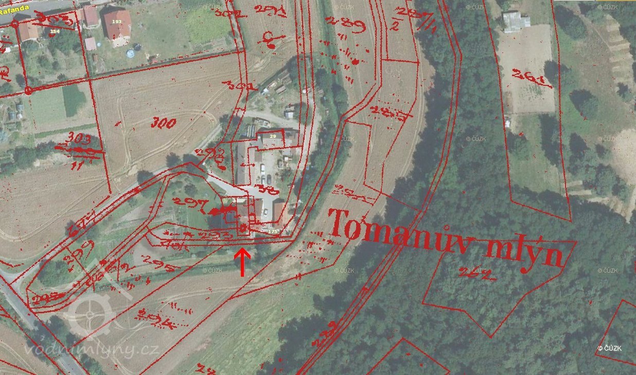 1907: Mlýn leží na potoku Čepeli č.parc. 705/2, který se nad mlýnem rozšiřuje v nádržku č.parc. 297. Z nádržky vyvedena jest voda krátkou strouhou se břehy opevněnými zdivem kvádříkovým v délce 6,50 m a průtočních šířkách 2 m na začátku, 1,45 m uprostřed a 0,80 m m bezprostředně před stavítkem vpouštěcím. Stavítko toto uzavírá vstupní otvor klenutý ve zdi lednice (o světlé šířce 0,80 m) v níž uložen též práh stavítka. Odtud dále v lednici vede vantrok v délce 2,39 m nad nejvyšší bod kola. Šířka vantroku jest 0,80 m, výška 0,21 m, výška spodní plochy na konci vantrok nad kolem obnáší 0,25 m. Celková výška klenutí lednice totiž ode dna až po vantrok (při zdi) obnáší 3,10 m.