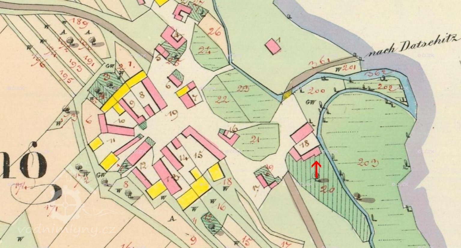 Popis1930: 1 kolo na spodní vodu, hltnost 0,569 m3/s, spád 1,55 m, výkon 5,5 HP