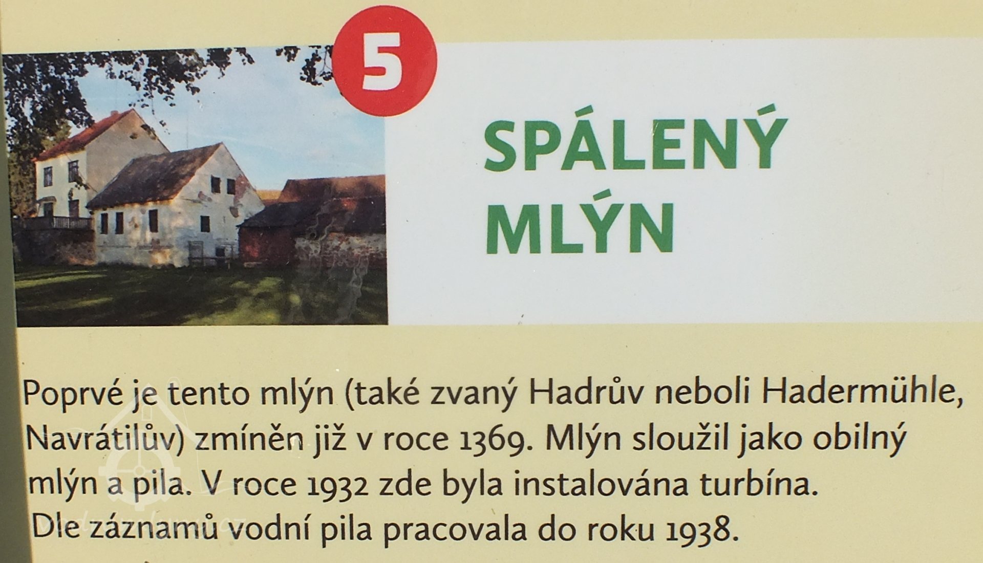 Navrátilův mlýn – také Spálený, Hadrův – Hadrmühle, Navrátil, Králík, Kaltuš – to vše jsou majitelé mlýna, o němž je první zmínka z roku 1369. (No.666)