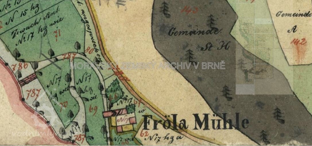 Popis1930: 1 kolo na spodní vodu, hltnost 0,465 m3/s, spád 1,44 m, výkon 5,5 HP