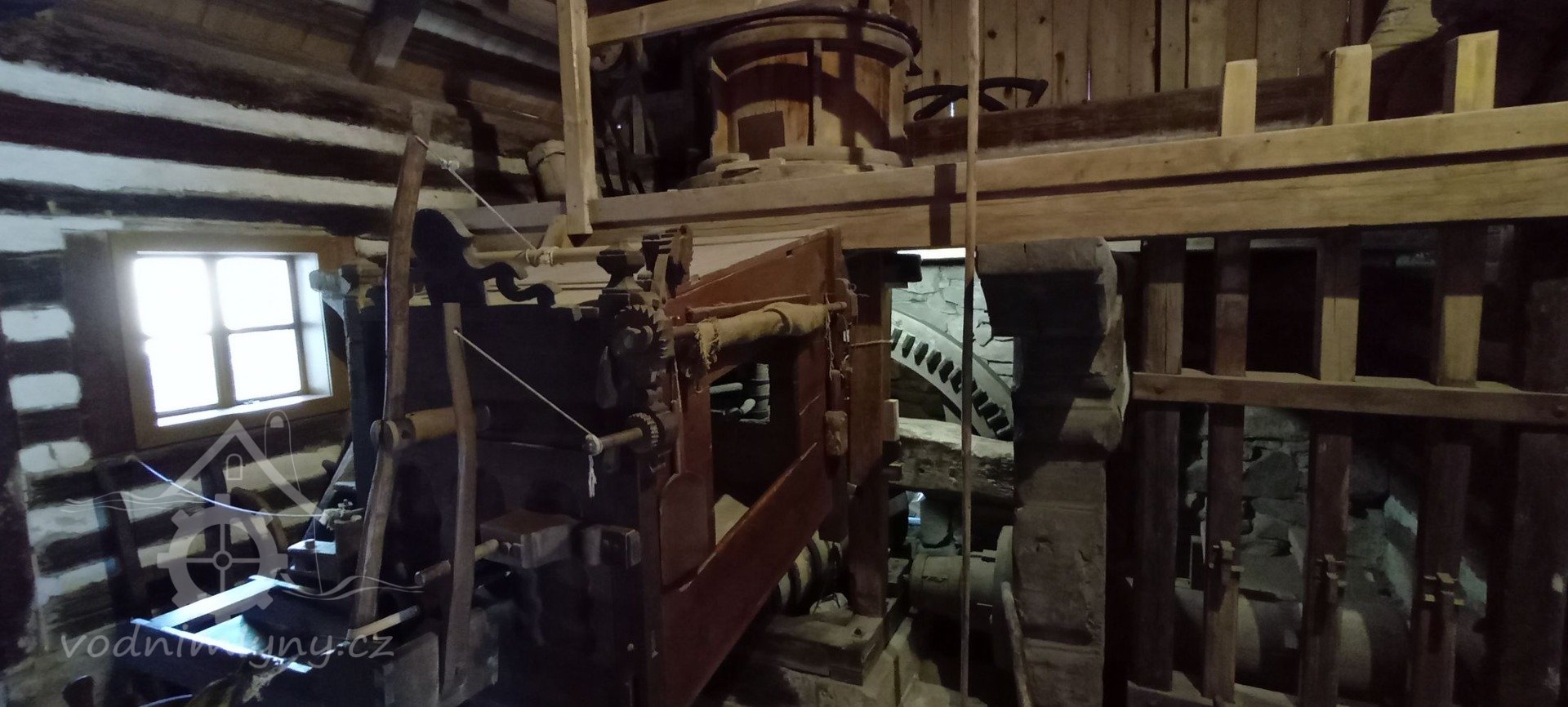 Mlýnice, 01 2024, © Vabi 82, (Prvky na obrázku: transmise, řemenice, převody - paleční kola, pastorky a cévníky (řemeslný výrobek))