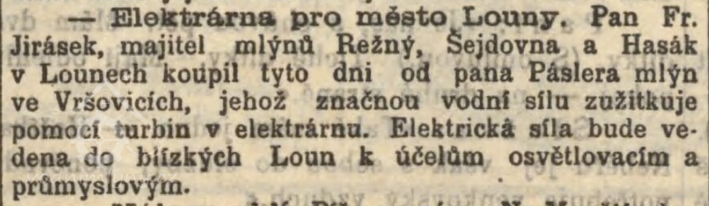 V r. 1900 koupil mlýn od Páslera Fr. Jirásek, majitel mlýnů Režný, Šejdovna a Hasák, kde zamýšlel zřídit elektrárnu pro Louny. (RR)