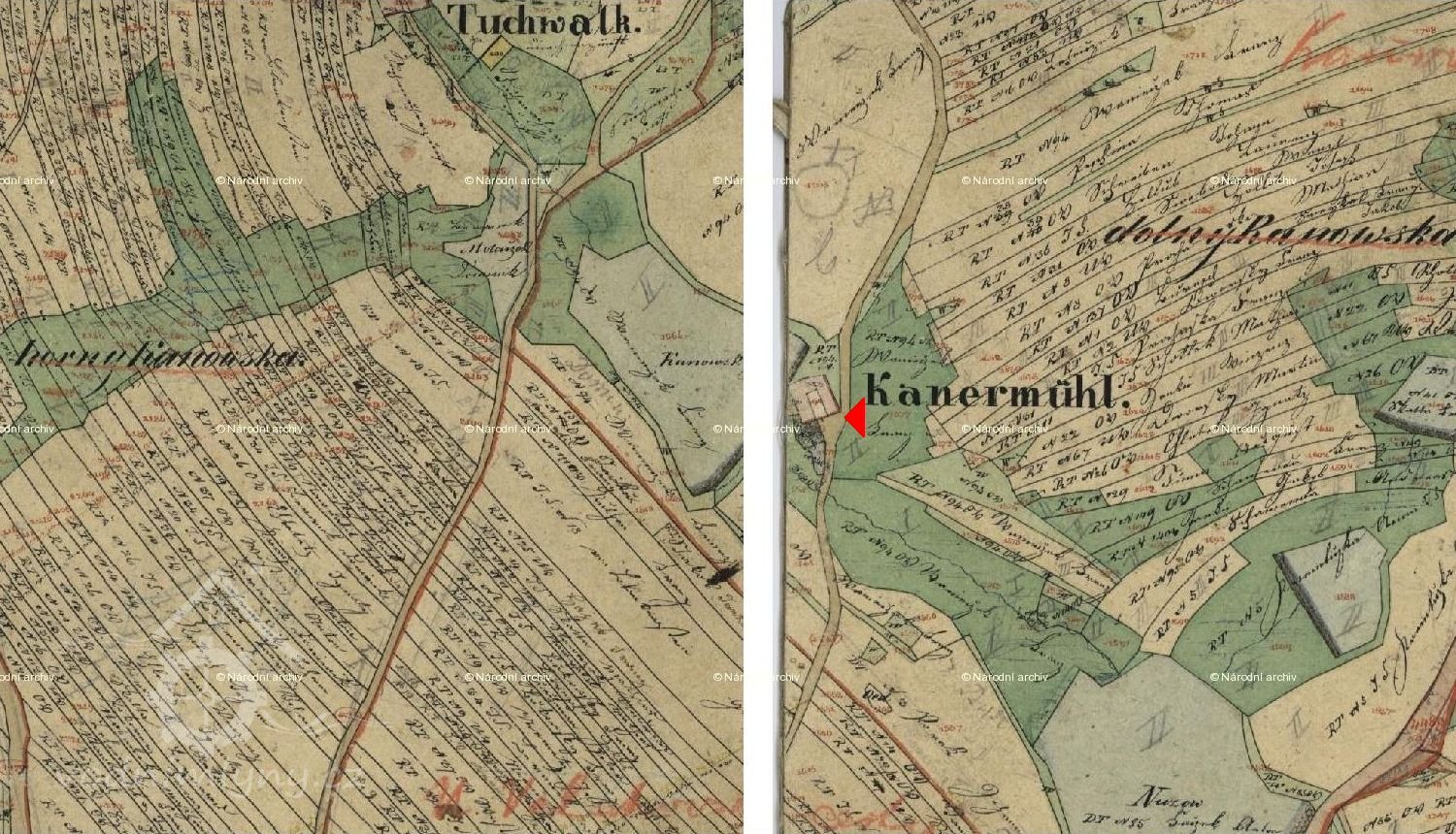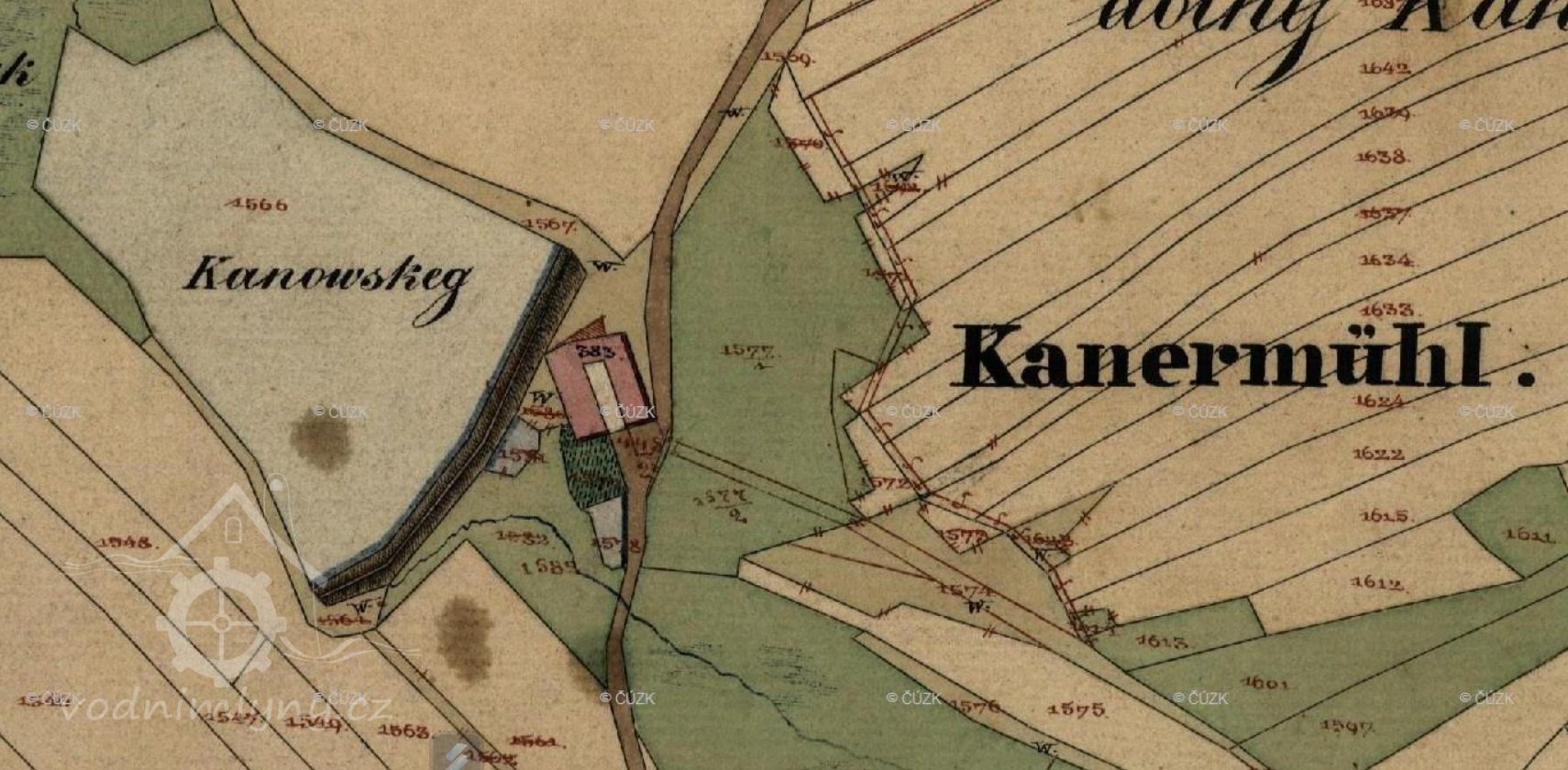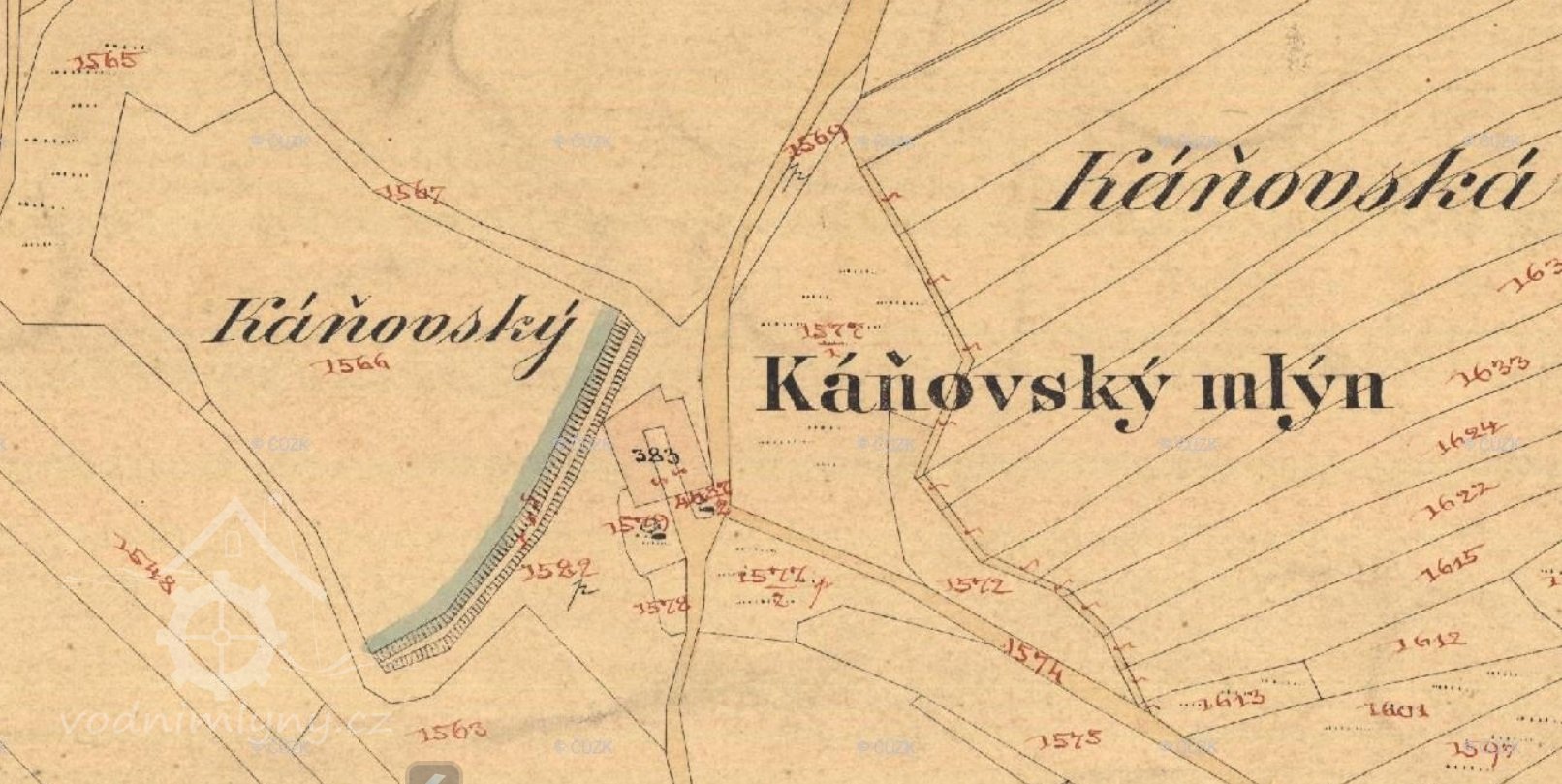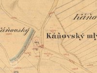 Na Káňovském rybníce č.kat.1566 leží mlýn zv. Káňovský Mlýn čp.335 se stoupami, hospodář. mlátička.
