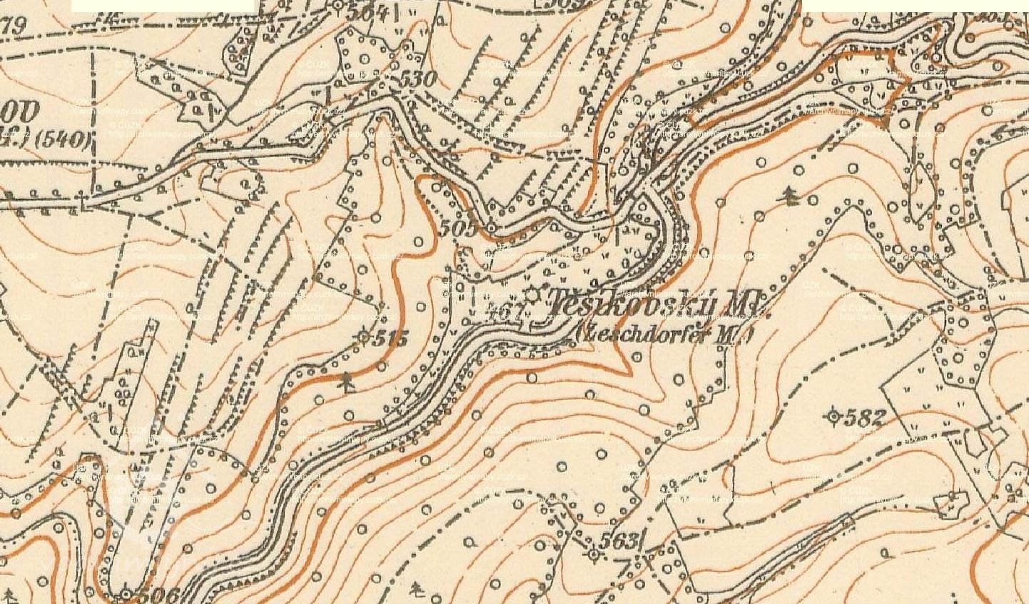 Na samotném okraji východního katastru obce se nacházela samota Těšíkovský mlýn (čp. 41), kde byl mlýn a pila (1932 - nájemce Ludwig). Na náhonu Trusovického (Bělkovického) potoka byla instalována jako pohonná jednotka Francisova turbína s průtočným množstvím 200 l/s a výkonu 8,14 kW. V současné době je zde obnovena pouze vodní nádrž.