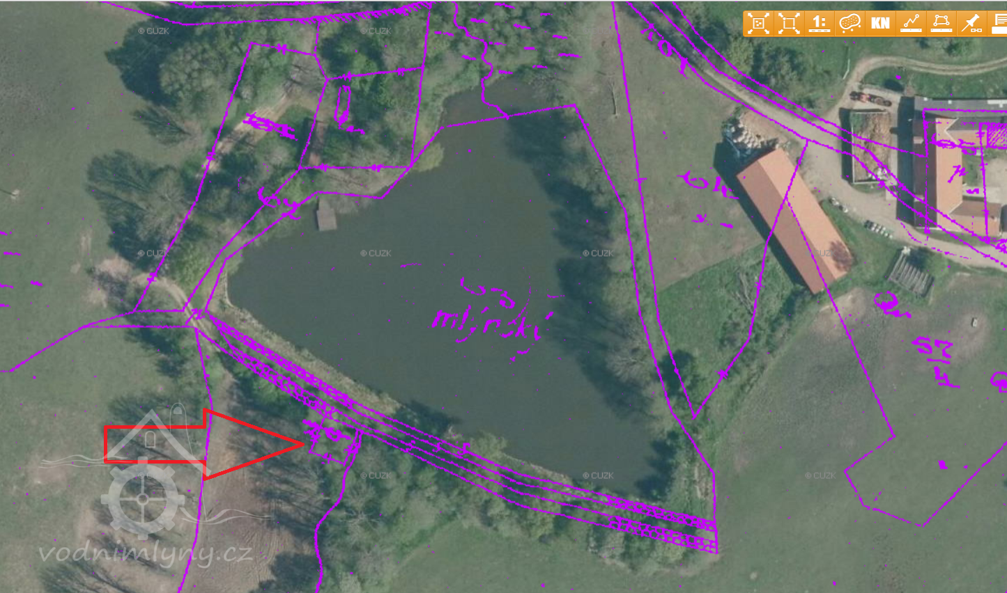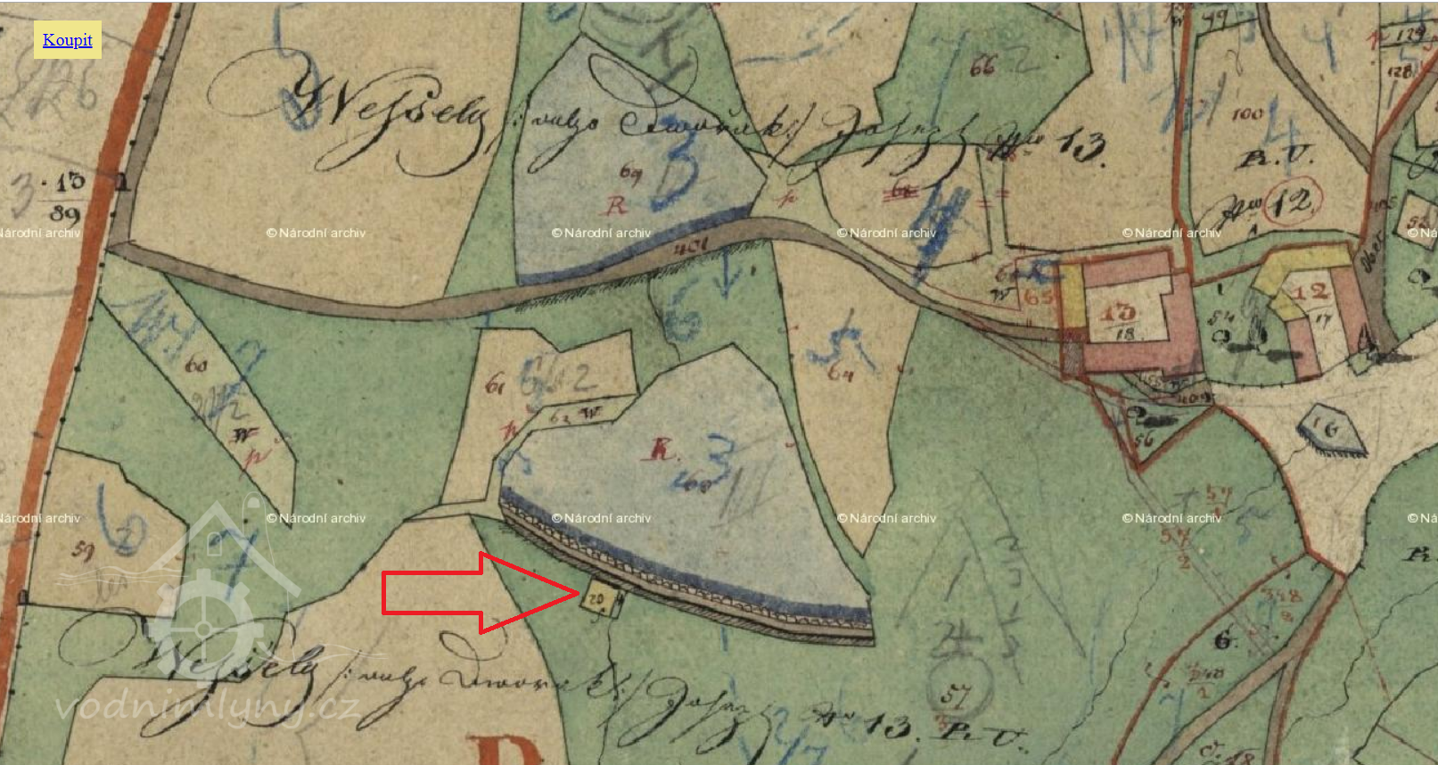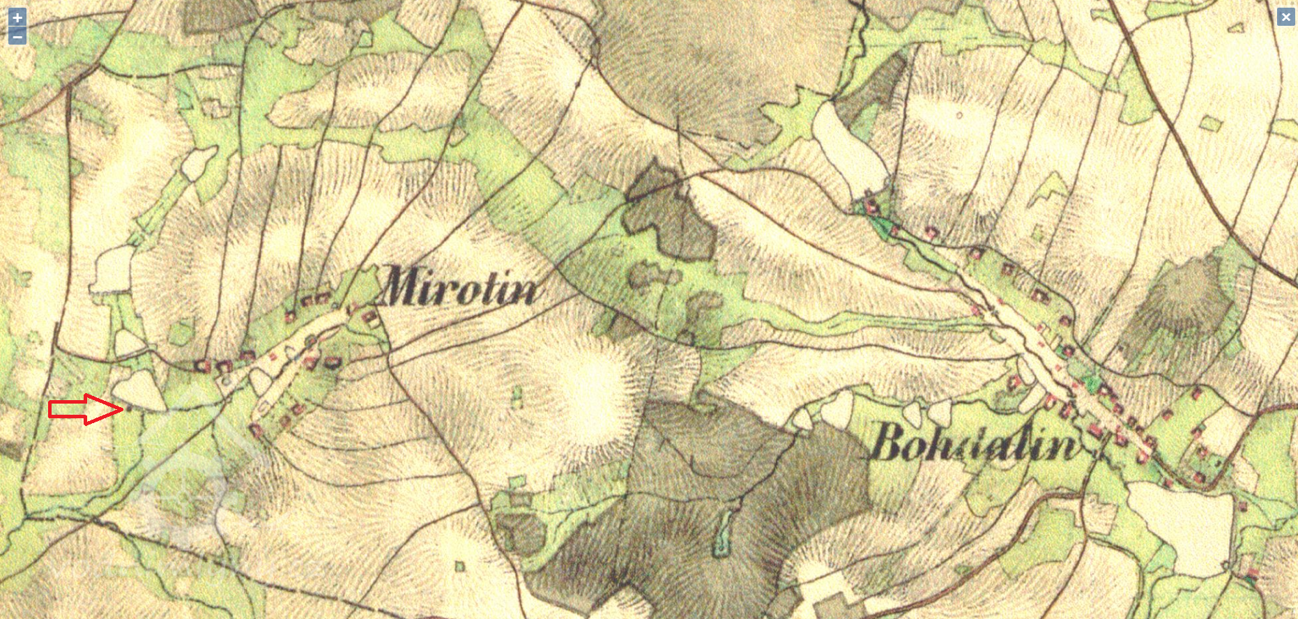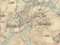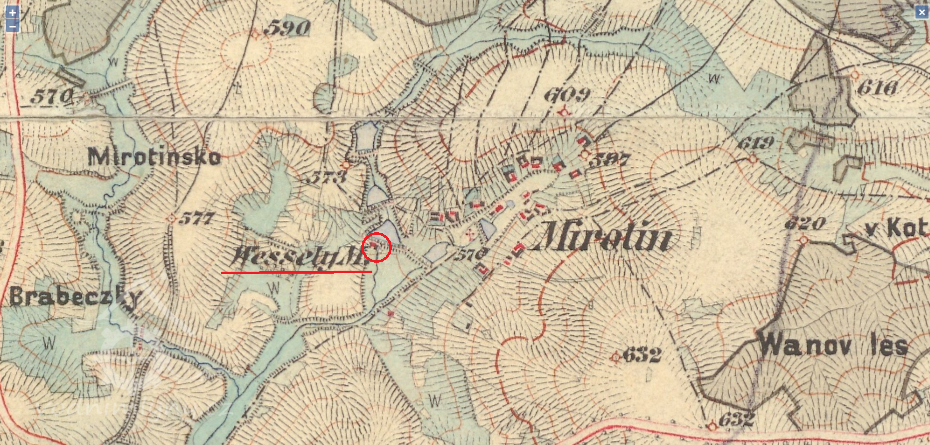 Malý mlýnek bez vlastního čp. (příslušenství statku Veselých čp. 13) pod hrází Mlýnského rybníka u Mirotína. Dnes po něm není ani památky.