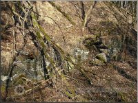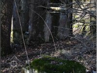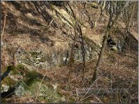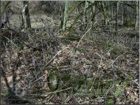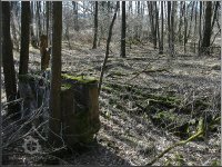 Další pozůstatky po vedlejší mlýnské budově, v pozadí stará cesta od Srubů k Liščí, nad níž se nacházejí základy hlavní mlýnské budovy, 03 2012, © Petr Bílek
