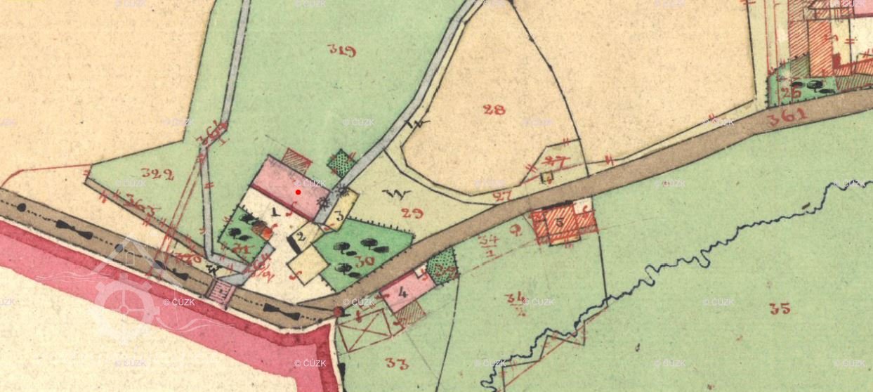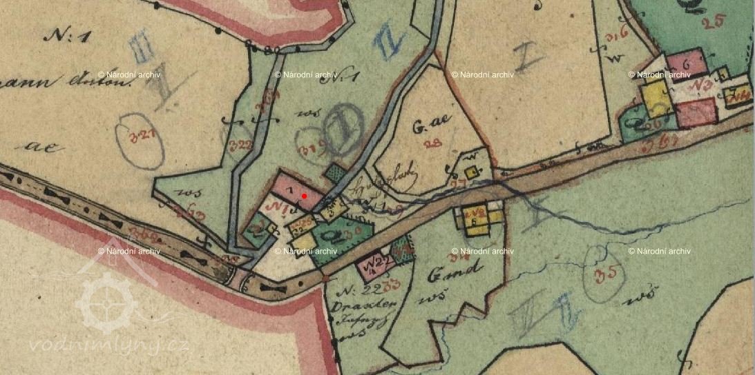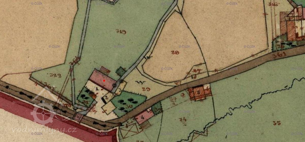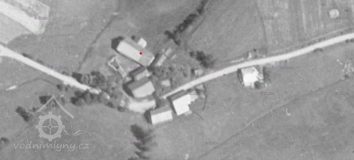 V Berní rule 1654 mlýn zaznamenán ještě není. Kolem poloviny 18. století v obci Tereziánský katastr uvádí 13 usedlostí. Ve fasi se objevuje mlynář na mlýně o jednom kole. V roce 1706 je mlýn zaznamenán na hraniční mapě. Soupis obyvatel z roku 1784 – pod č. 1 je mlýn Petra Baumanna. V roce 1839 všichni obyvatelé německé národnosti. Roku 1837 ve skice stabilního katastruje uveden Anton Baumann, obytná budova zděná, mlýnice dřevěná, 1 kolo, další 2 větší a jedna malá spalná budova. V otisku stabilního katastru je zděná budova mlýna společně s mlýnicí a jedním kolem, druhá spalná budova také s jedním kolem.