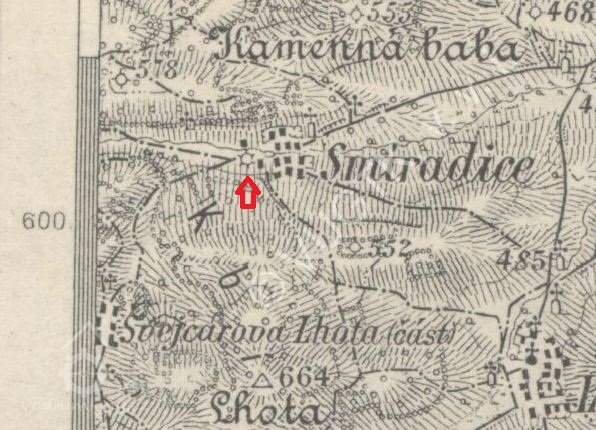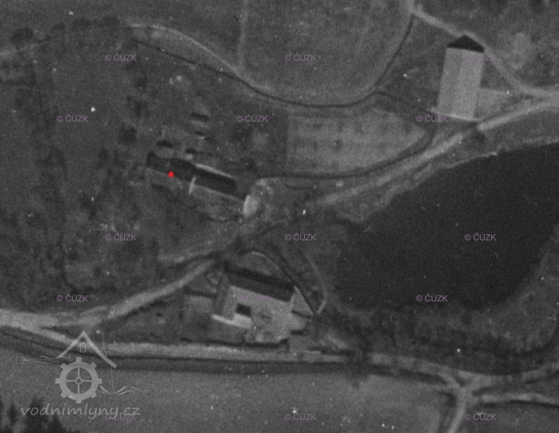 Uzavřený areál bývalého vodního mlýna má mlýnici a přilehlou stodolou do tvaru písmene L s vjezdem z východní strany. (JV)