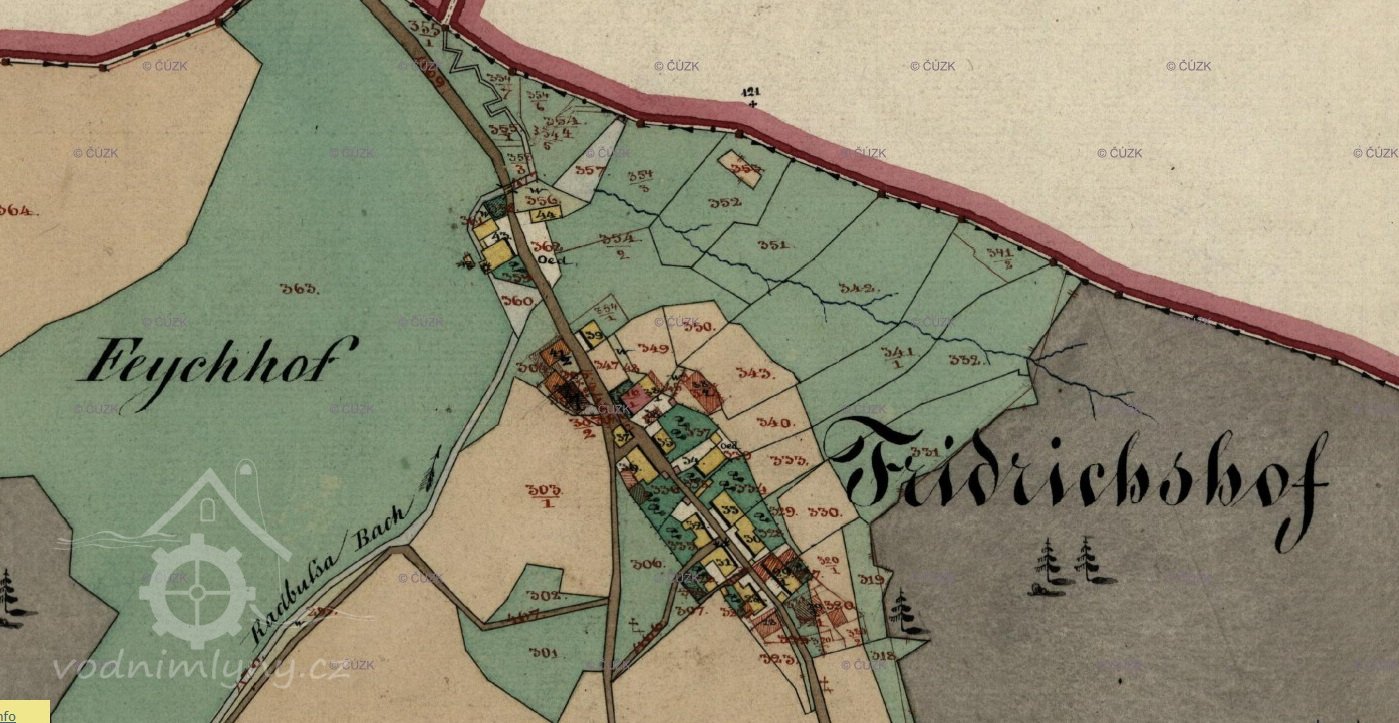 Obec je na I. vojenském mapování, bez značky mlýna. V letech 1806 -1809 je zde uváděn mlynář Ferdinand Portner. Na II. Vojenském mapování ( 1836-1852 ) je uveden MM a SM. Je i na III. vojenském mapování. Skica stabilního katastru z roku 1838: dvě spojené nespalné budovy do písmene U s 1 kolem, trojúhelníková vodní nádržka, druhá budova bez vodního přítoku bude zřejmě bývalá pila, na otisku budovy mlýna, pila bez kola. Schallerova topografie tu v roce 1839 uvádí mlýn a pilu. Obyvatelsto německé národnosti.