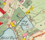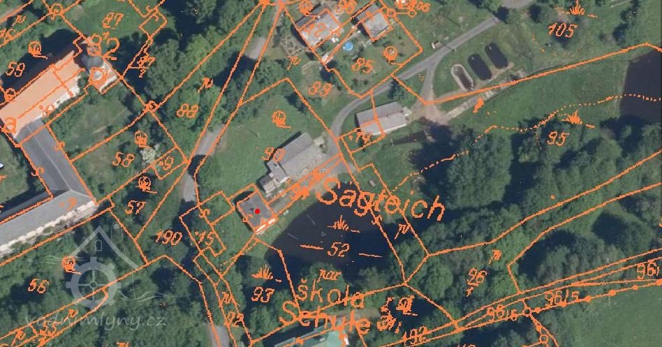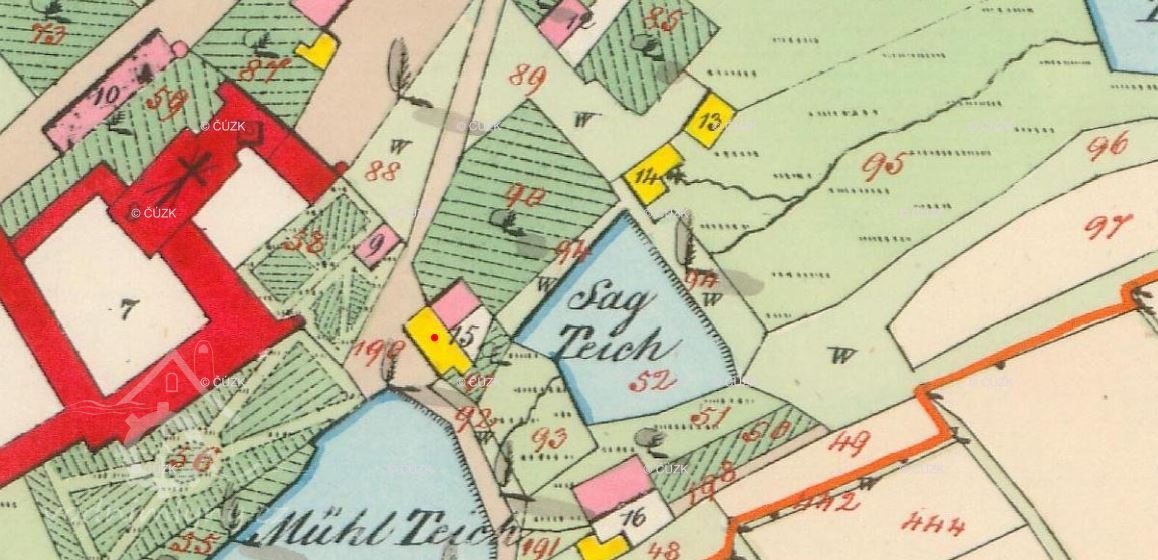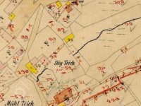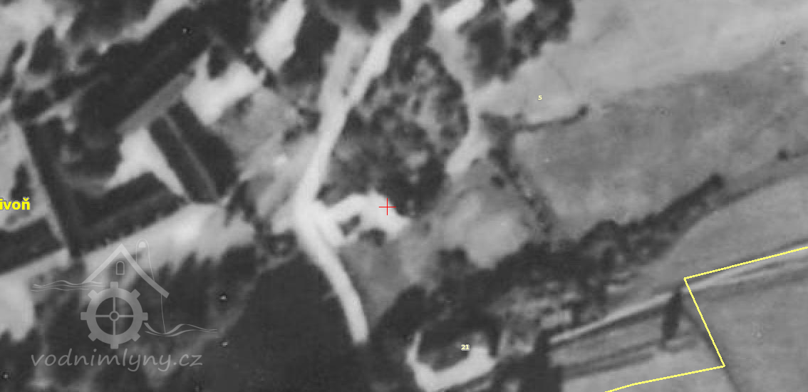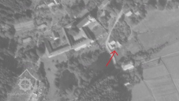 Na skice a otisku stabilního katastru v roce 1838 zakreslen mlýnský rybník, nespalná budova s jedním kolem, k hlavní budově menší dřevěná přístavba. Pod mlýnem je zakreslen další rybník a pila.