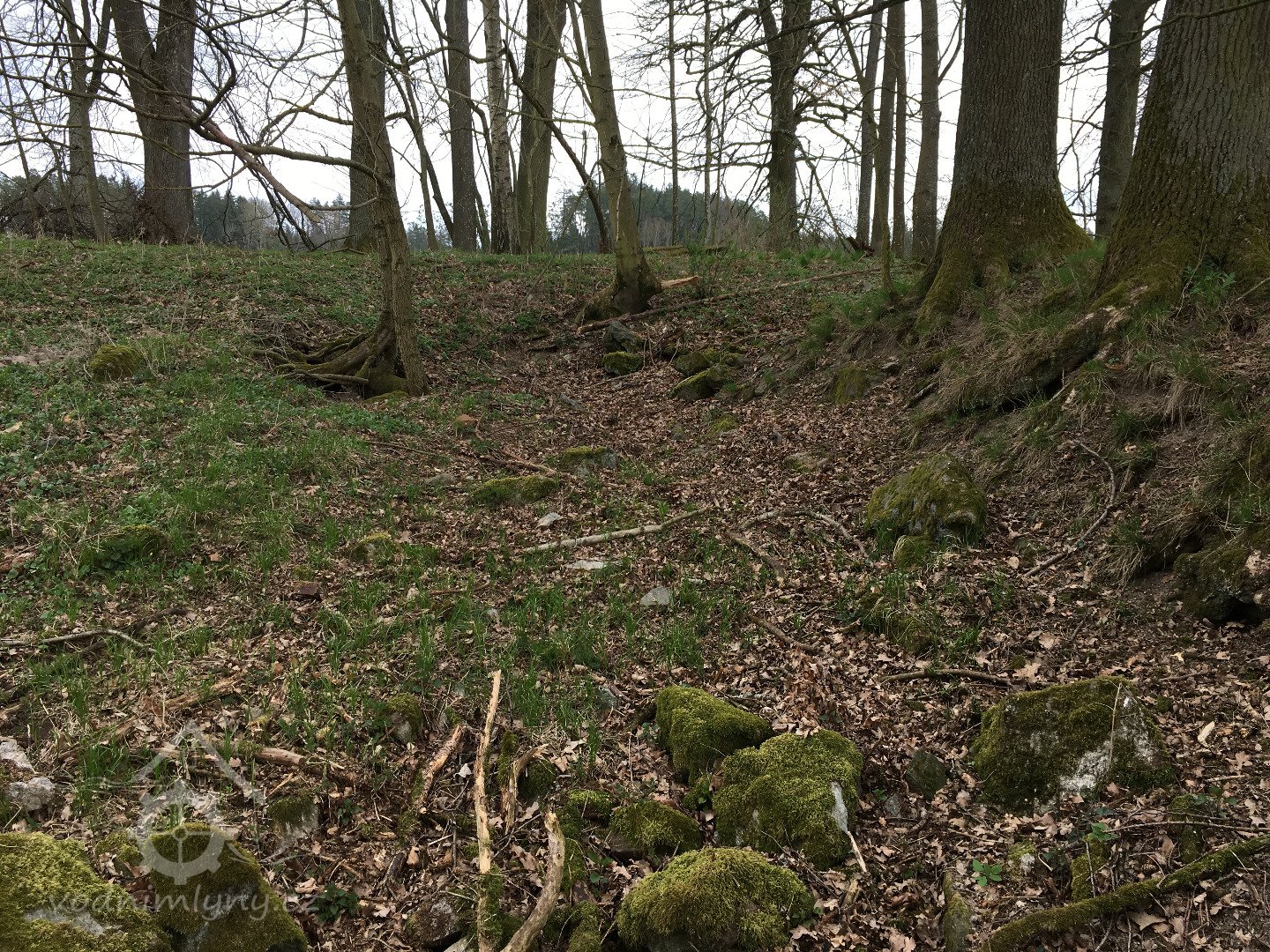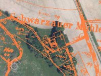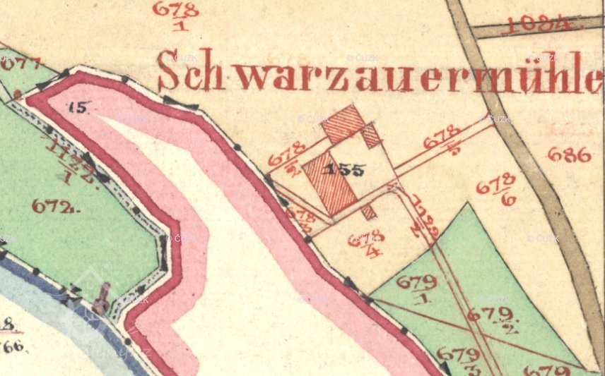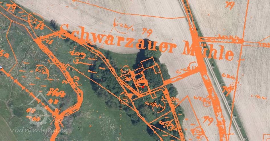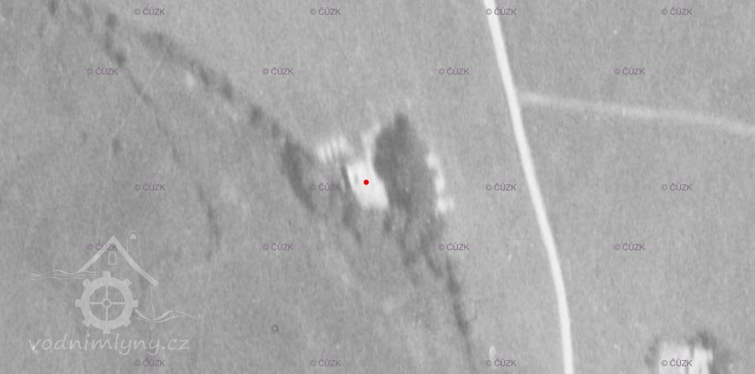 Je zobrazen na otisku stabilního katastru a originální mapě z roku 1838 - náhon se v pravém úhlu stáčí k jihu okolo kratší strany hlavní nespalné budovy, u mlýna další dvě menší nespalné budovy a jedna malinká, odtokový kanál šikmo za mlýnem směrem k potoku, je zakreslen jako nová stavba, takže vznikl krátce před tvorbou mapy.
