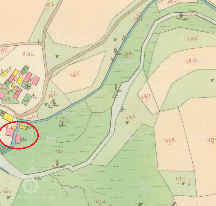 Popis1930: 1 kolo na svrchní vodu, hltnost 0,285 m3/s, spád 4,76 m, výkon 11,75 HP