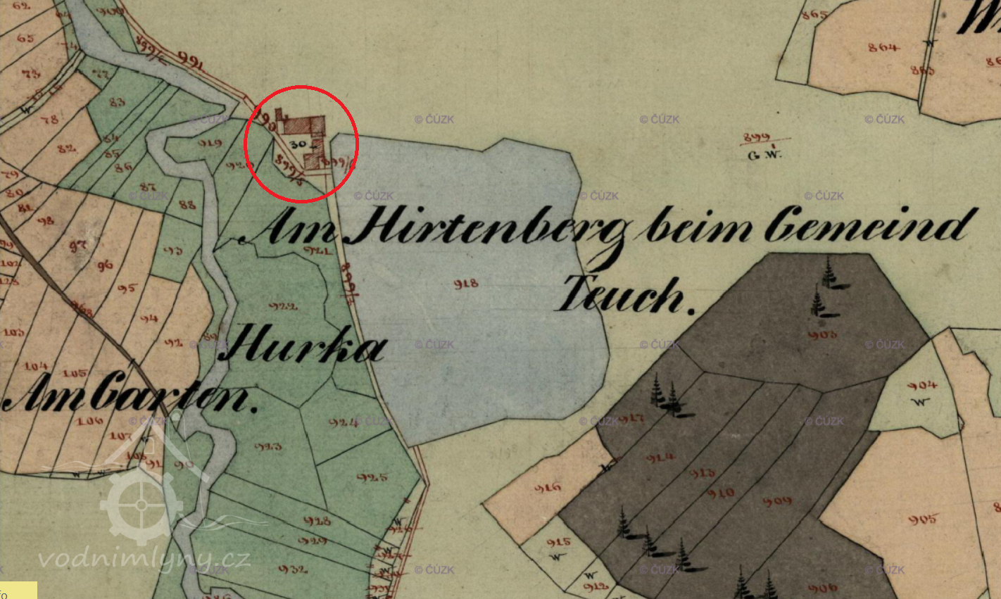 Popis1930: 1 kolo na svrchní vodu, hltnost 0,161 m3/s, spád 3,54 m, výkon 5 HP