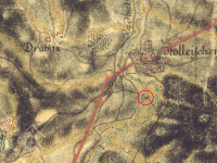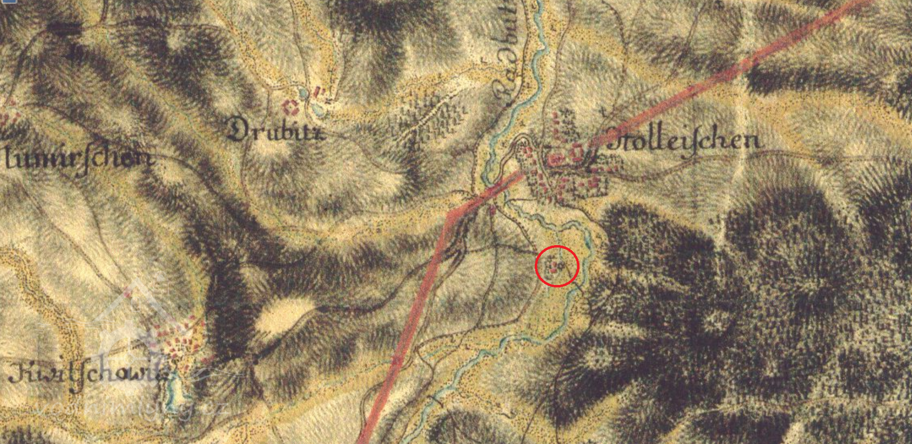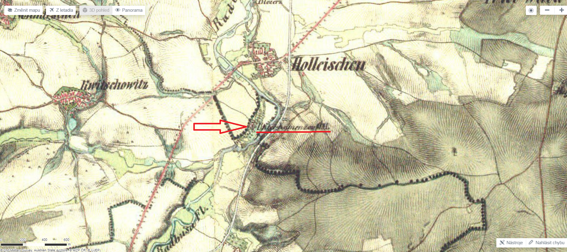 3,4 km severně od kapličky v Dolní Kamenici, 950 m jižně od kostela sv. Petra a Pavla v Holýšově