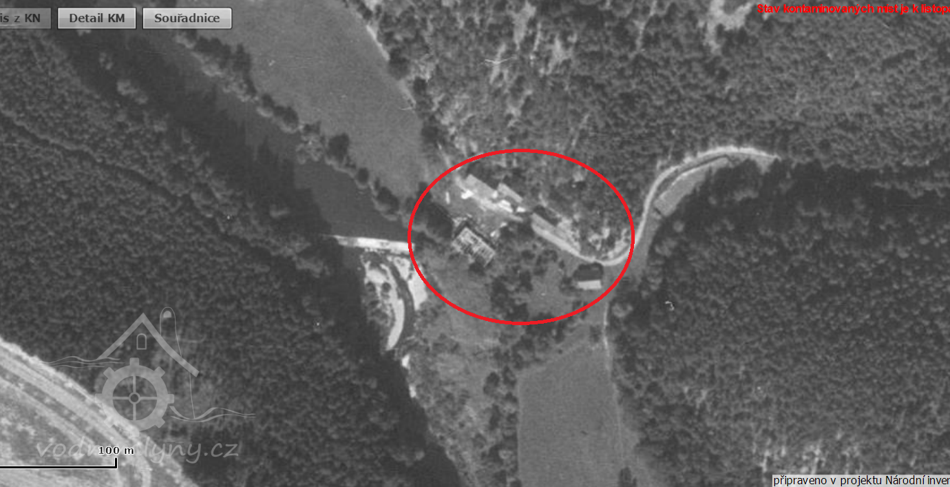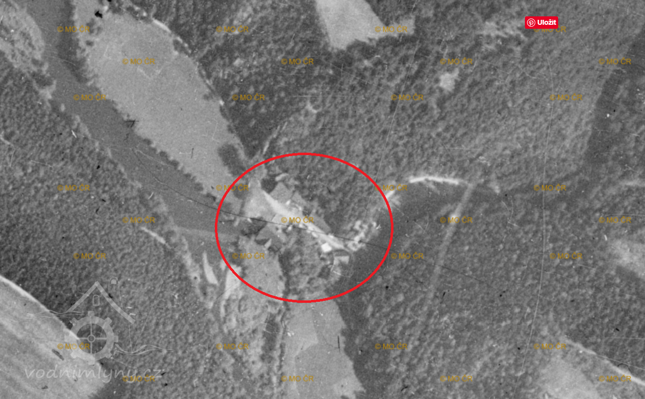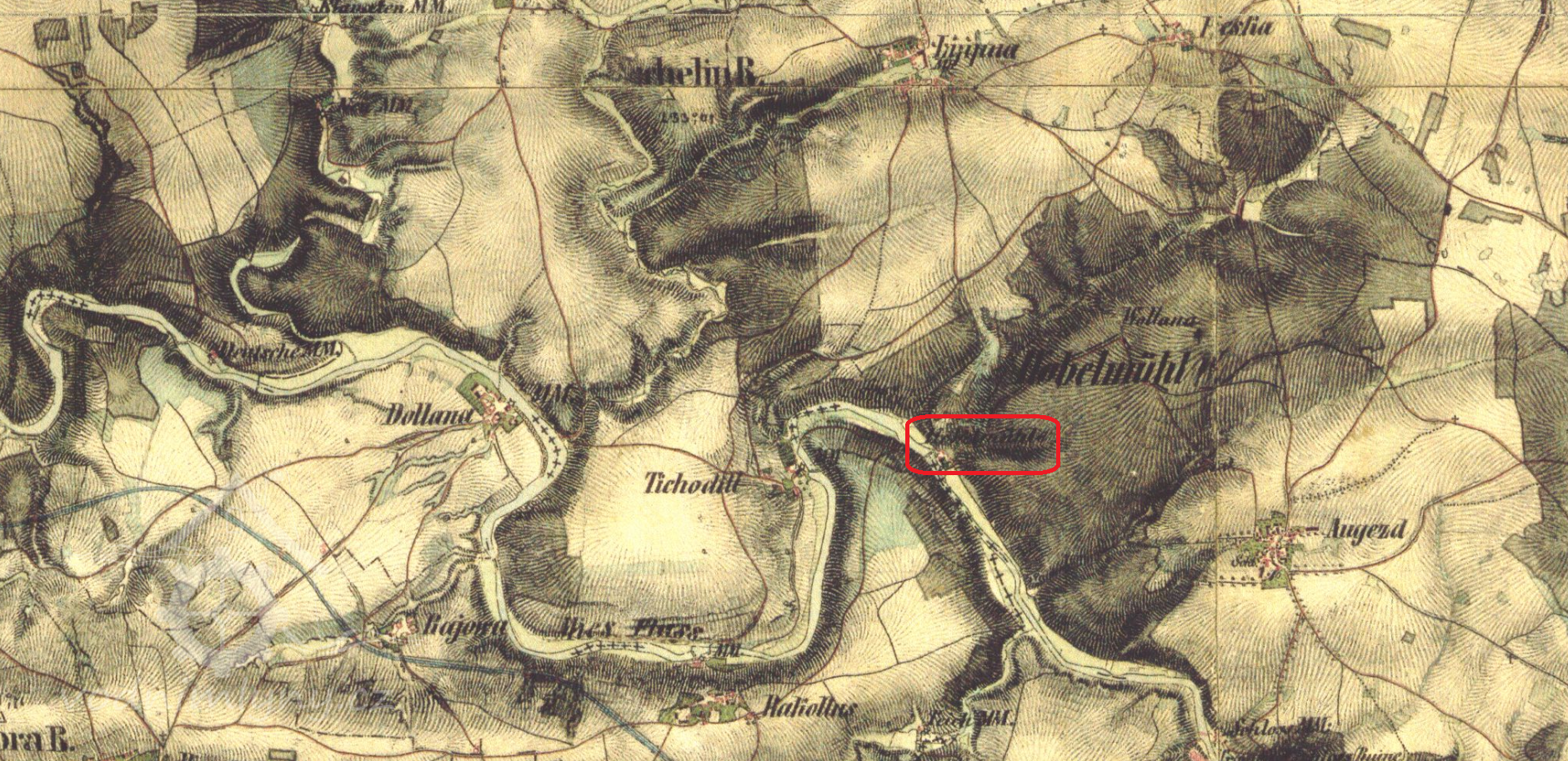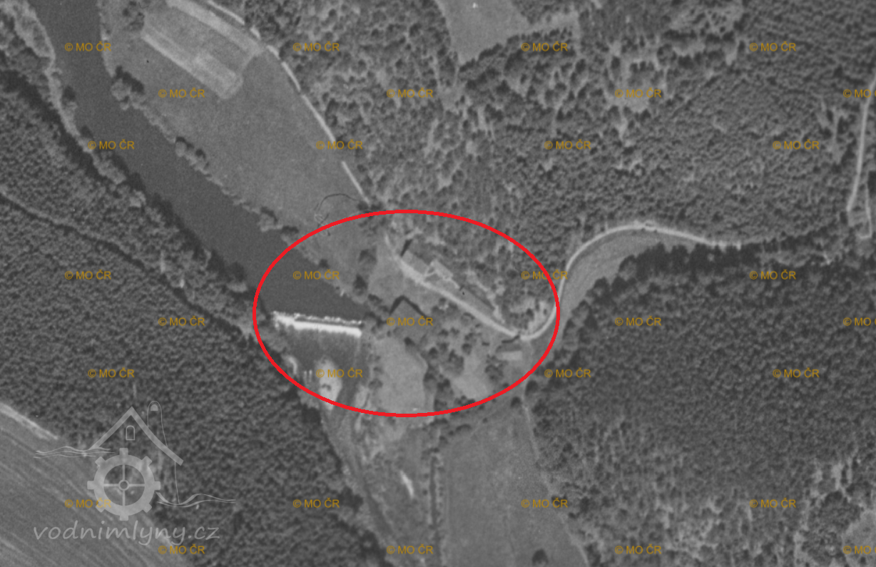 Rozlehlý mlýnský areál na samotě u řeky jižně od obce, poč. 20. stol. redukovaný pouze na pilu, 1964 zatopený Hracholuskou přehradou.