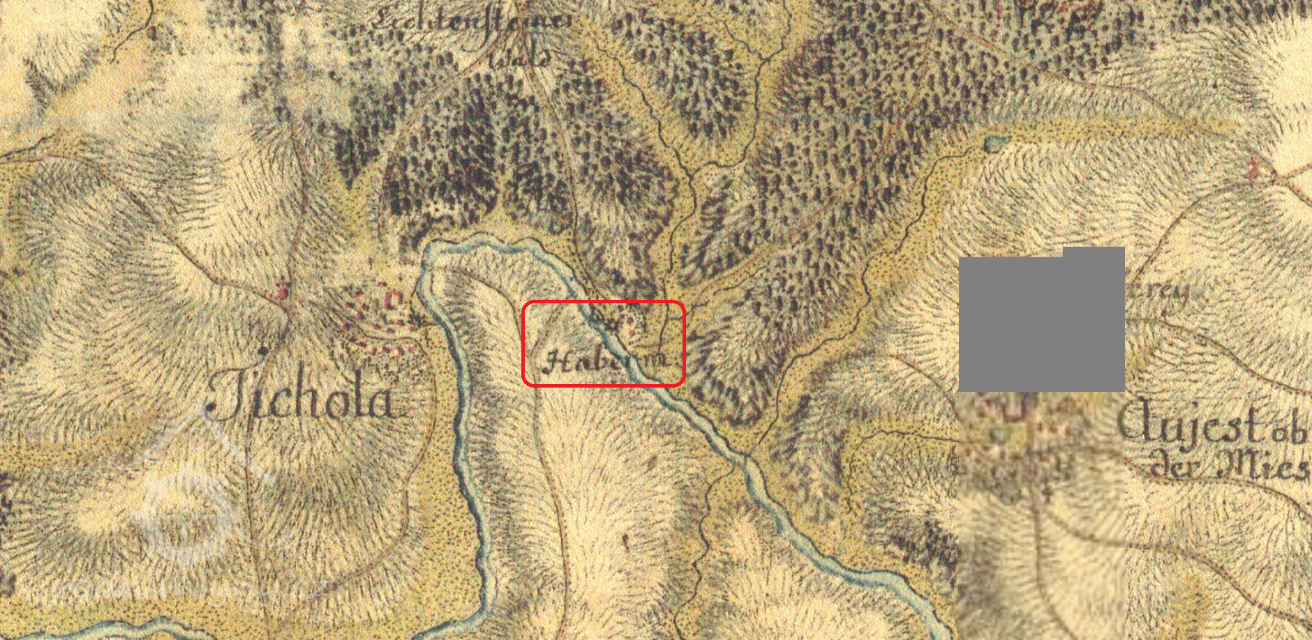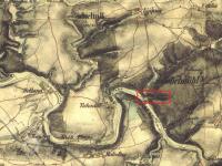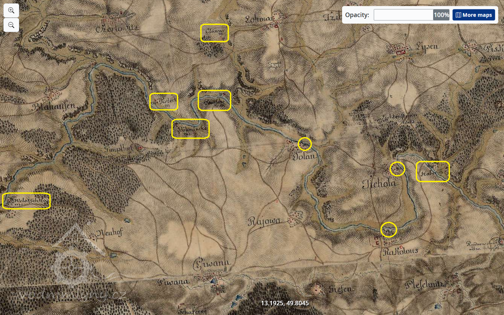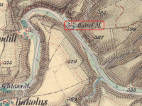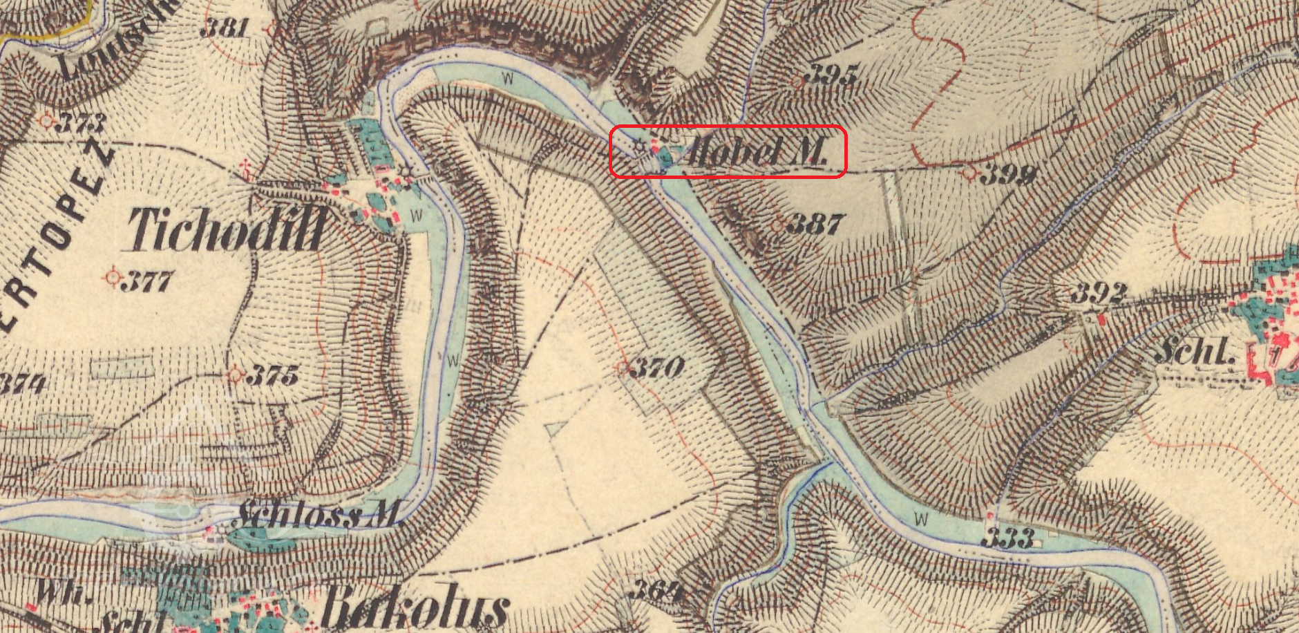 Rozlehlý mlýnský areál na samotě u řeky jižně od obce, poč. 20. stol. redukovaný pouze na pilu, 1964 zatopený Hracholuskou přehradou.
