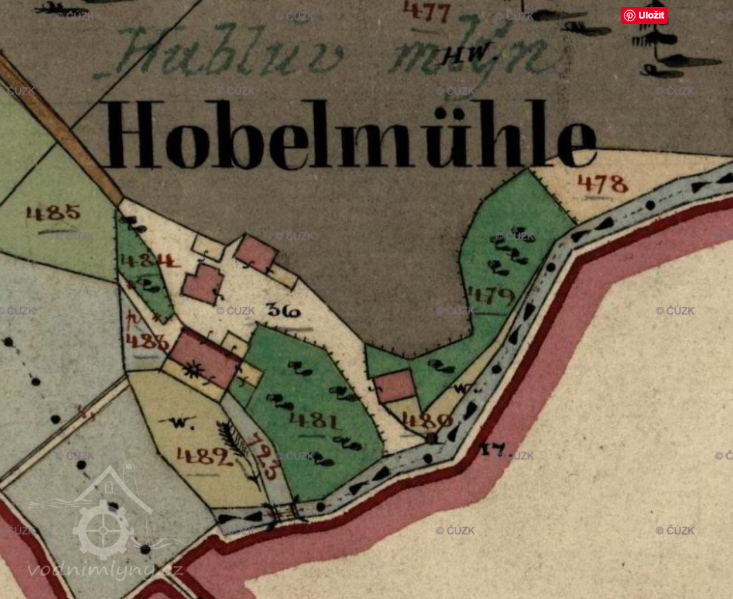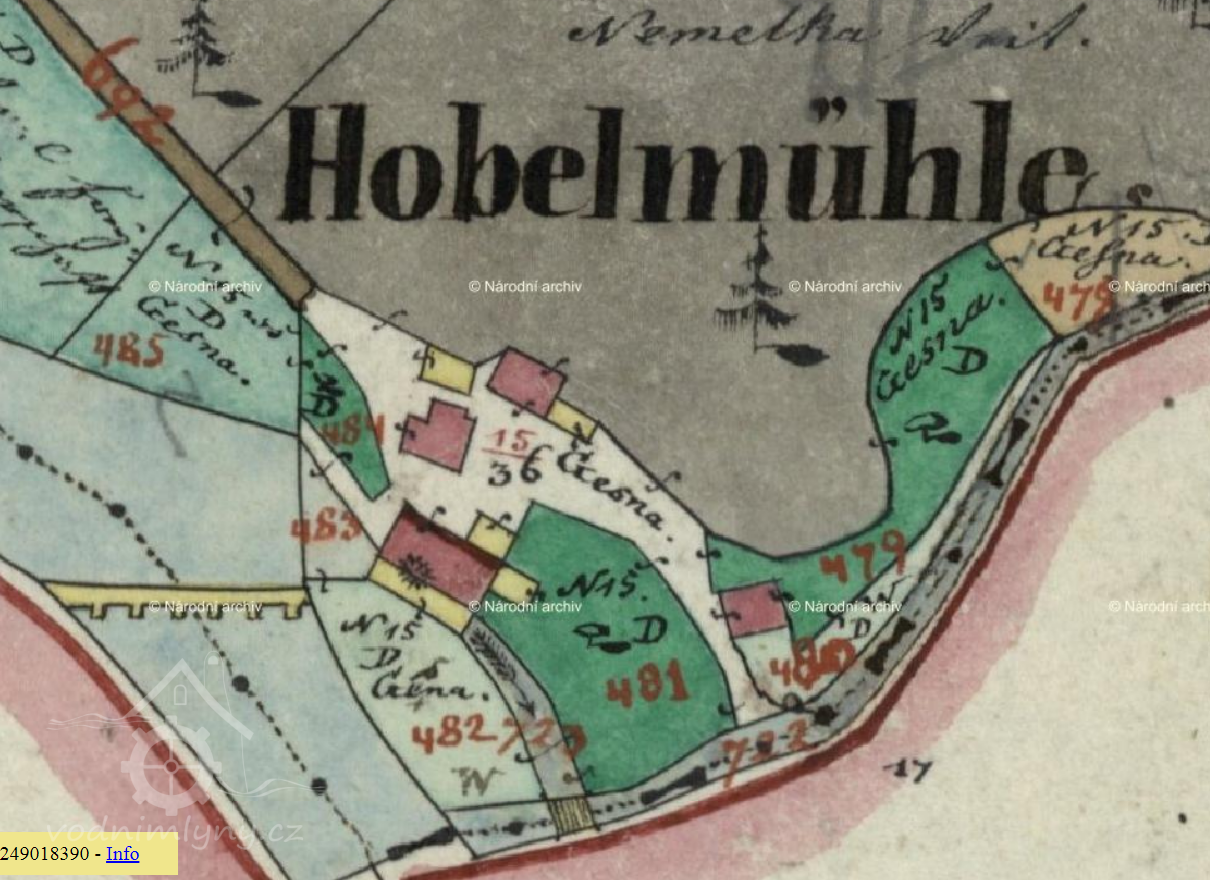 Popis1930: 1 kolo na spodní vodu, hltnost 1,655 m3/s, spád 1,3 m, výkon 8,6 HP