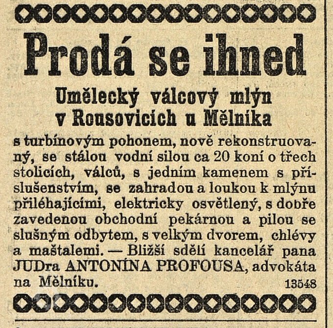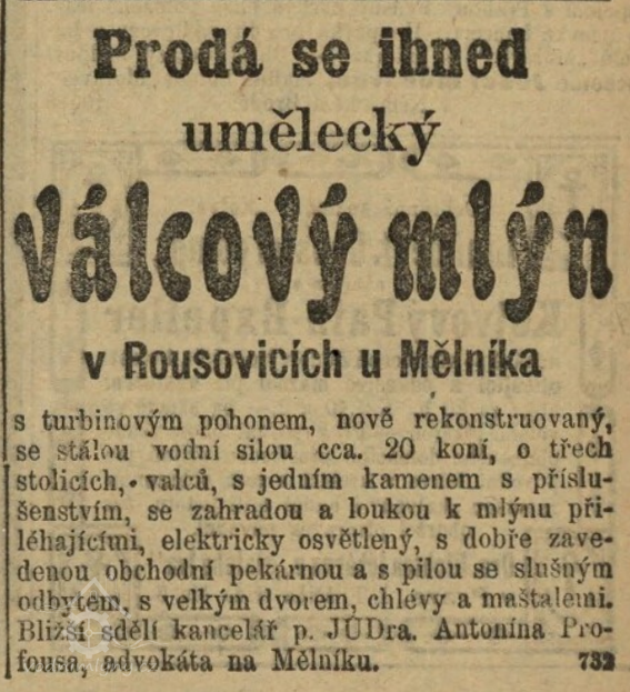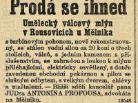 V květnu 1910 byl mlýn nabízen k prodeji. (RR)