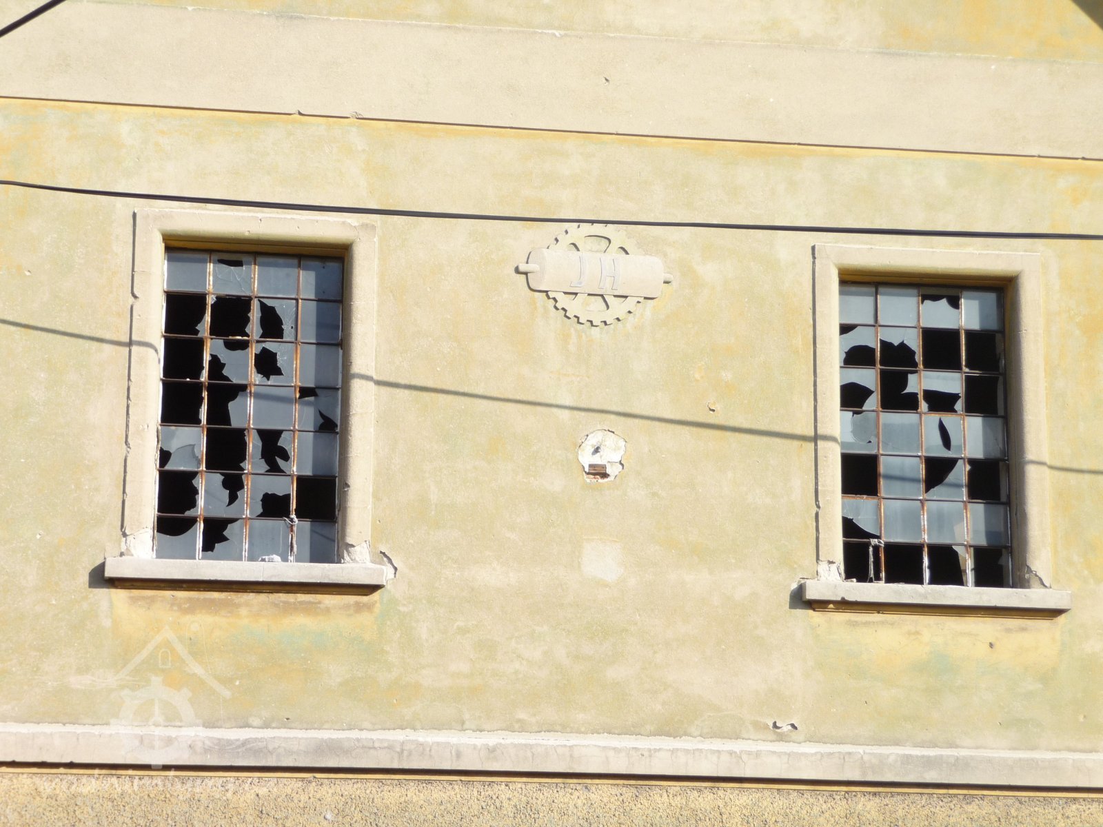 Na štítech je znak válcového mlýna a iniciály JH mlynáře Josefa Holečka.